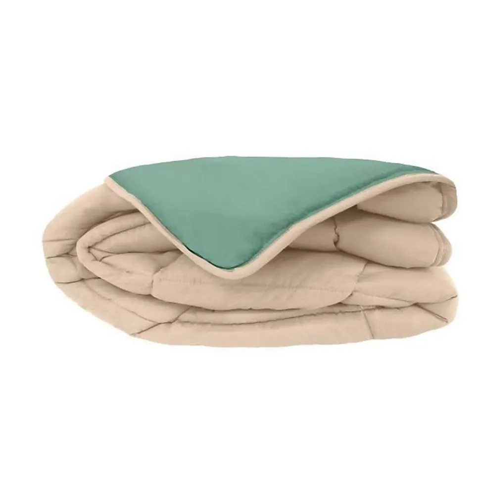 CALGARY Couette bicolore Gris galet et Vert lac – 100% polyester fibres creuses siliconées pour un grammage de 400 g/m² – Dimensions : 200×200 cm – Enveloppe 100% polyester microfibre avec finition piquage carreaux – Garantie oeKO-TEX / STOPFLAM – Traitement ignifugé – Lavage a 40°C.