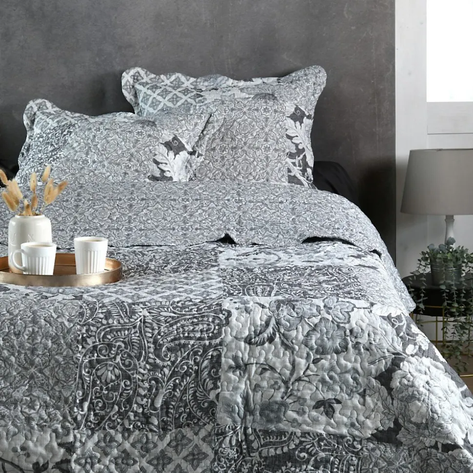 Découvrez un couvre-lit décoratif original et indémodable pour votre lit deux personnes. Le boutis OCTAVIA coloris gris est réversible et accompagné de 2 taies d’oreillers de dimensions 65 x 65 cm reprenant le même motif.Caractéristiques du couvre-lit boutis OCTAVIA:Dimensions du couvre-lit: 260×240 cmRéversible2 taies d’oreiller 65×65 cmComposition : 100% polyesterCe couvre-lit est conforme aux exigences du décret n°2000-164 du 23 février 2000.Label de qualité OEKO-TEX STANDARD 100 garantissant l’absence de substances nocives pour la santé et pour l’environnement.