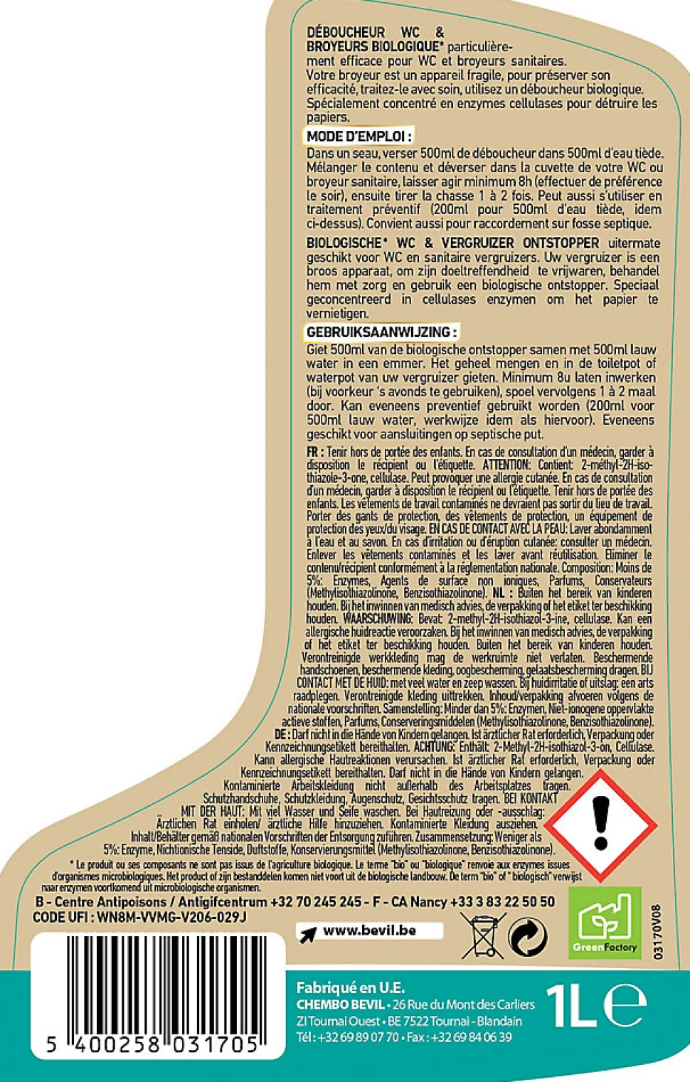 Produit biologique, préserve le bon fonctionnement de votre broyeur. Votre broyeur est un appareil fragile, pour préserver son efficacité, traitez-le avec soin, utilisez un déboucheur biologique. Spécialement concentré en enzymes cellulases pour détruire les papiers. Déboucheur biologique particulièrement efficace pour WC et broyeurs sanitaires.