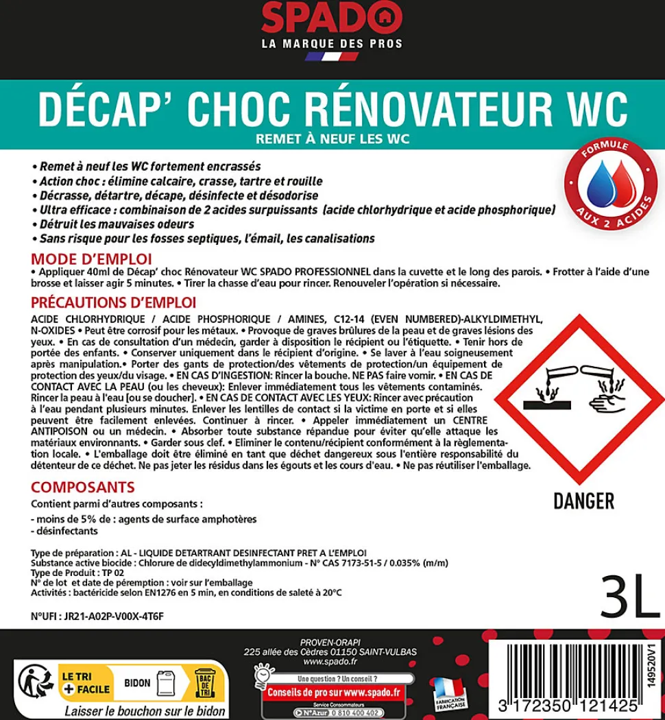 - Ultra efficace: combinaison de 2 acides surpuissants (acide chlorhydrique et phosphorique)