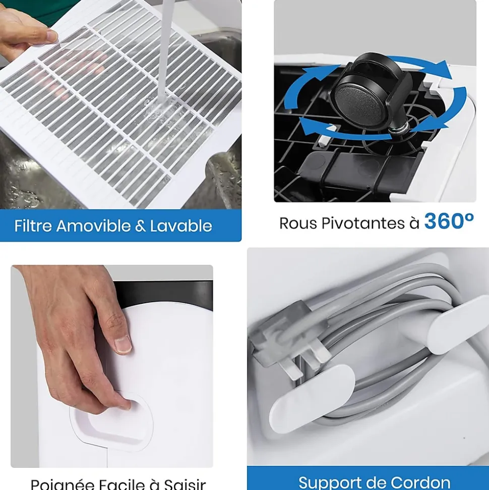 Déshumidificateur portable à haute efficacité : Doté d’une efficacité de travail élevée avec une capacité de déshumidification allant jusqu’à 50L par jour, ce déshumidificateur fournit un air sec et frais pour les pièces de moins de 60 ㎡, et l’humidité peut être réglée librement entre 30 % et 80 % selon vos besoins.