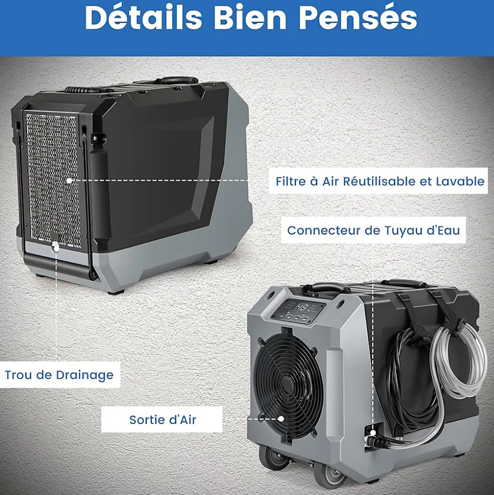 - Détails conviviaux: Notre déshumidificateur est conçu pour être conviviaux, avec un filtre amovible et lavable et 2 sangles pour ranger proprement les câbles et les drains. Ce design convivial garantit un entretien facile et améliore la convivialité globale de l’appareil.