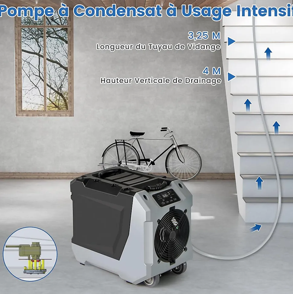 - Vidange pratique & facile : La pompe à condensat intégrée et le tuyau de 325cm assurent une vidange continue, pour votre plus grand confort. Avec une poignée pliable, 2 poignées de transport et 2 roulettes, ce déshumidificateur de pièce peut être facilement transporté.