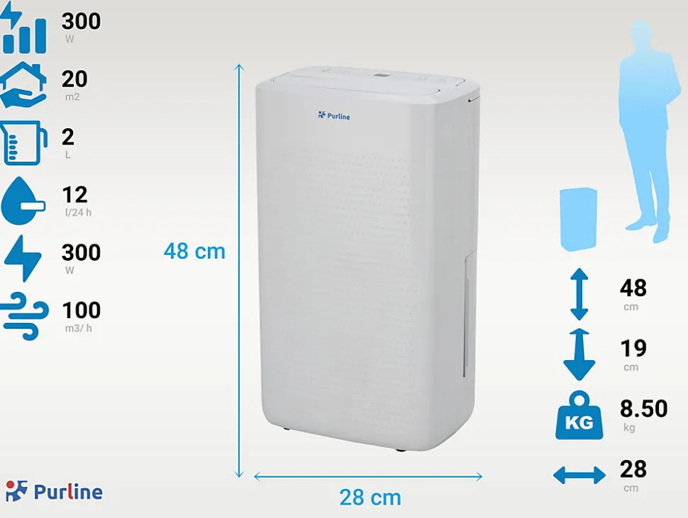 Saviez-vous qu’un taux d’humidité élevé peut favoriser l’apparition de bactéries et de particules nuisibles à la santé ? Avec le déshumidificateur DRYOS 12, éliminez l’humidité et améliorez la qualité de l’air dans votre maison efficacement et facilement.Le DRYOS 12 allie puissance et technologie avec un panneau de contrôle LED intuitif qui vous permet d’ajuster l’humidité entre 30% et 80% selon vos besoins. Son réservoir de 12 litres avec arrêt de sécurité automatique et option de vidange continue garantit un fonctionnement durable et sans souci. En outre, il est doté d’une minuterie de 24 heures et d’une fonction pratique de séchage des vêtements qui accélère le processus de séchage, ce qui le rend encore plus polyvalent.De conception moderne et compacte (28x19x48 cm, 9 kg), le DRYOS 12 est facile à transporter grâce à sa poignée intégrée, idéal pour les espaces jusqu’à 20 m2. Son fonctionnement silencieux (Le DRYOS 12 ne se contente pas de contrôler l’humidité, il transforme votre maison en un espace plus sain et plus confortable.