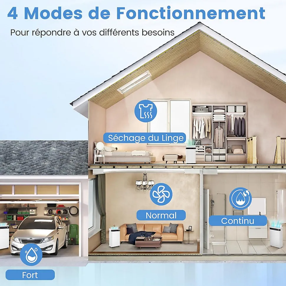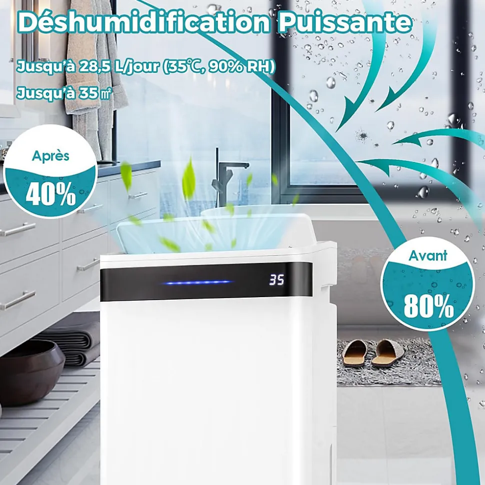 Notre déshumidificateur améliorera l’ambiance de votre maisonAvec 4 modes et 2 vitesses de ventilateur, ce déshumidificateur peut répondre à vos différents besoins. Le panneau LED tactile clair est facile à utiliser et le voyant lumineux à 3 couleurs montre instantanément le niveau d’humidité actuel. D’autre part, le réservoir d’eau de 5,5 L peut être vidé à la fois automatiquement et manuellement. Avec le mode de fonctionnement silencieux, vous pourrez dormir confortablement. Dans un espace de 35 m², le déshumidificateur peut déshumidifier jusqu’à 28,5 L/Jour. Il peut être utilisé dans les chambres, les caves, les chambres d’enfants, etc.