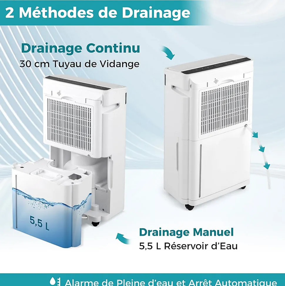 - Drainage Flexible et Facile à Déplacer : Avec le tuyau de drainage de 30 cm inclus, le déshumidificateur portable intelligent peut drainer automatiquement, ou vous pouvez également vider manuellement le réservoir d’eau de 5,5 L. De plus, les 4 roues universelles et les poignées intégrées facilitent le déplacement de l’appareil.