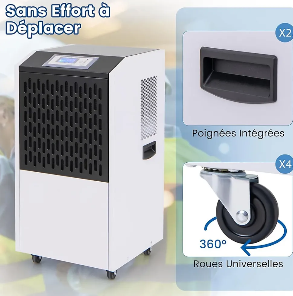 - Mobilité Assurée : Grâce à 2 poignées intégrées robustes, 4 roues universelles, la tuyau de drainage de 1m et le câble d’alimentation de 174 cm, la déshumidification devient mobile et plus efficace dans tous les coins des espaces.