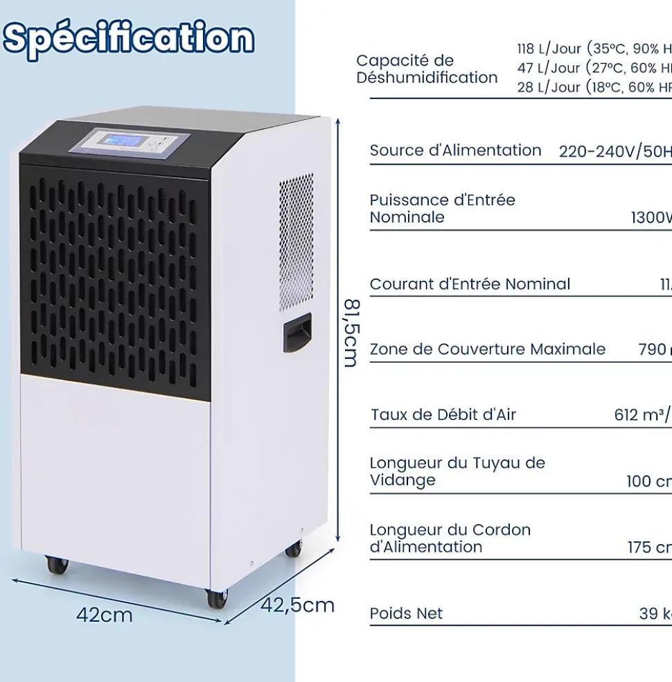- Haute Efficacité : Notre déshumidificateur excelle dans le contrôle de l’humidité dans les grands espaces jusqu’à 790 m², capable de retirer jusqu’à 118 L par jour. Avec des réglages d’humidité ajustables de 10% à 98 % et une plage de température de 25°C à 56°C, cela rend le déshumidificateur extrêmement polyvalent pour différentes conditions environnementales.