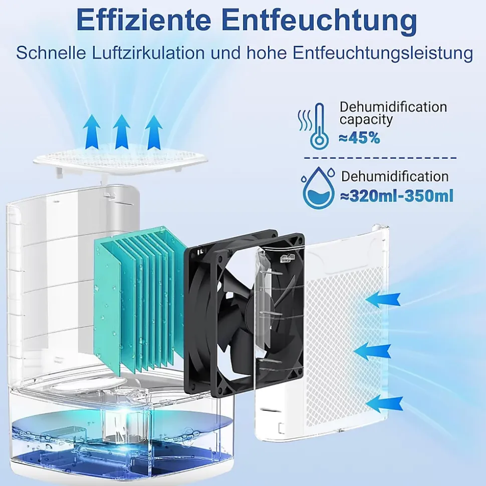 【Déshumidification efficace】Le déshumidificateur électrique élimine efficacement l’humidité de l’air et dispose d’un grand réservoir d’eau de 1400 ml, idéal pour les chambres, les sous-sols ou les salles de bains. Il réduit les moisissures et les odeurs sans avoir à vider le réservoir fréquemment【Fonctionnement ultra-silencieux】En mode nuit, le déshumidificateur fonctionne à seulement 38 dB – plus silencieux qu’un ventilateur normal. Parfait pour les chambres à coucher, les chambres d’enfants ou les bureaux à domicile sans perturber le sommeil ou la concentration【Minuterie intelligente】Avec des réglages de minuterie pour 8, 16 ou 24 heures, le déshumidificateur s’éteint automatiquement lorsque le réservoir est plein ou que l’humidité tombe à 30 %. Sûr et économe en énergie pour une utilisation quotidienne【Éclairage LED et filtration de l’air】La LED 7 couleurs à intensité variable crée une atmosphère agréable et sert de veilleuse. Le filtre HEPA (efficacité du filtre de 99,97 %) élimine la poussière et les allergènes – idéal pour les personnes allergiques【Compact et mobile】Conception légère avec poignée de transport. Le couvercle du réservoir amovible facilite le nettoyage. Idéal pour les petites pièces, les bureaux ou les salles de stockage