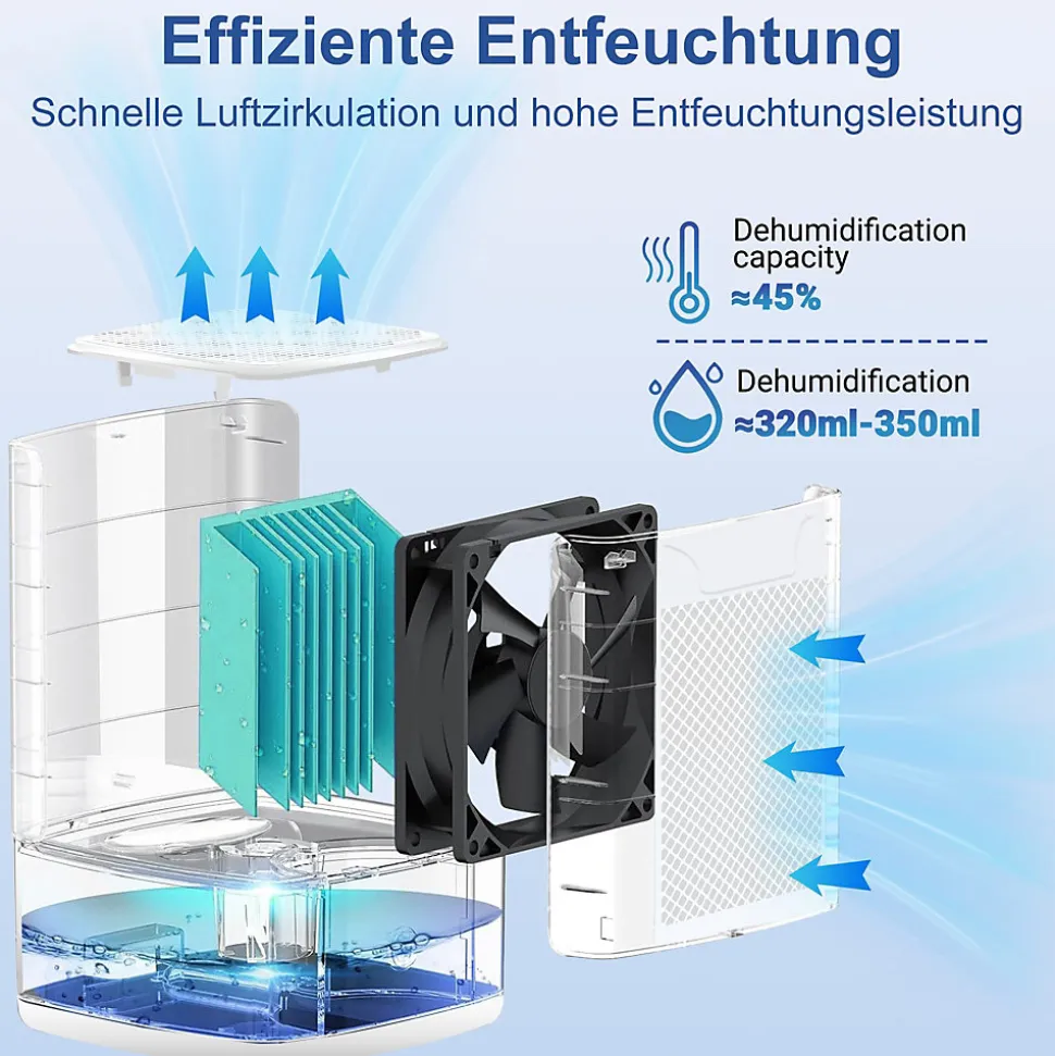 【Déshumidification efficace】Le déshumidificateur électrique élimine efficacement l’humidité de l’air et dispose d’un grand réservoir d’eau de 1400 ml, idéal pour les chambres, les sous-sols ou les salles de bains. Il réduit les moisissures et les odeurs sans avoir à vider le réservoir fréquemment【Fonctionnement ultra-silencieux】En mode nuit, le déshumidificateur fonctionne à seulement 38 dB – plus silencieux qu’un ventilateur normal. Parfait pour les chambres à coucher, les chambres d’enfants ou les bureaux à domicile sans perturber le sommeil ou la concentration【Minuterie intelligente】Avec des réglages de minuterie pour 8, 16 ou 24 heures, le déshumidificateur s’éteint automatiquement lorsque le réservoir est plein ou que l’humidité tombe à 30 %. Sûr et économe en énergie pour une utilisation quotidienne【Éclairage LED et filtration de l’air】La LED 7 couleurs à intensité variable crée une atmosphère agréable et sert de veilleuse. Le filtre HEPA (efficacité du filtre de 99,97 %) élimine la poussière et les allergènes – idéal pour les personnes allergiques【Compact et mobile】Conception légère avec poignée de transport. Le couvercle du réservoir amovible facilite le nettoyage. Idéal pour les petites pièces, les bureaux ou les salles de stockage