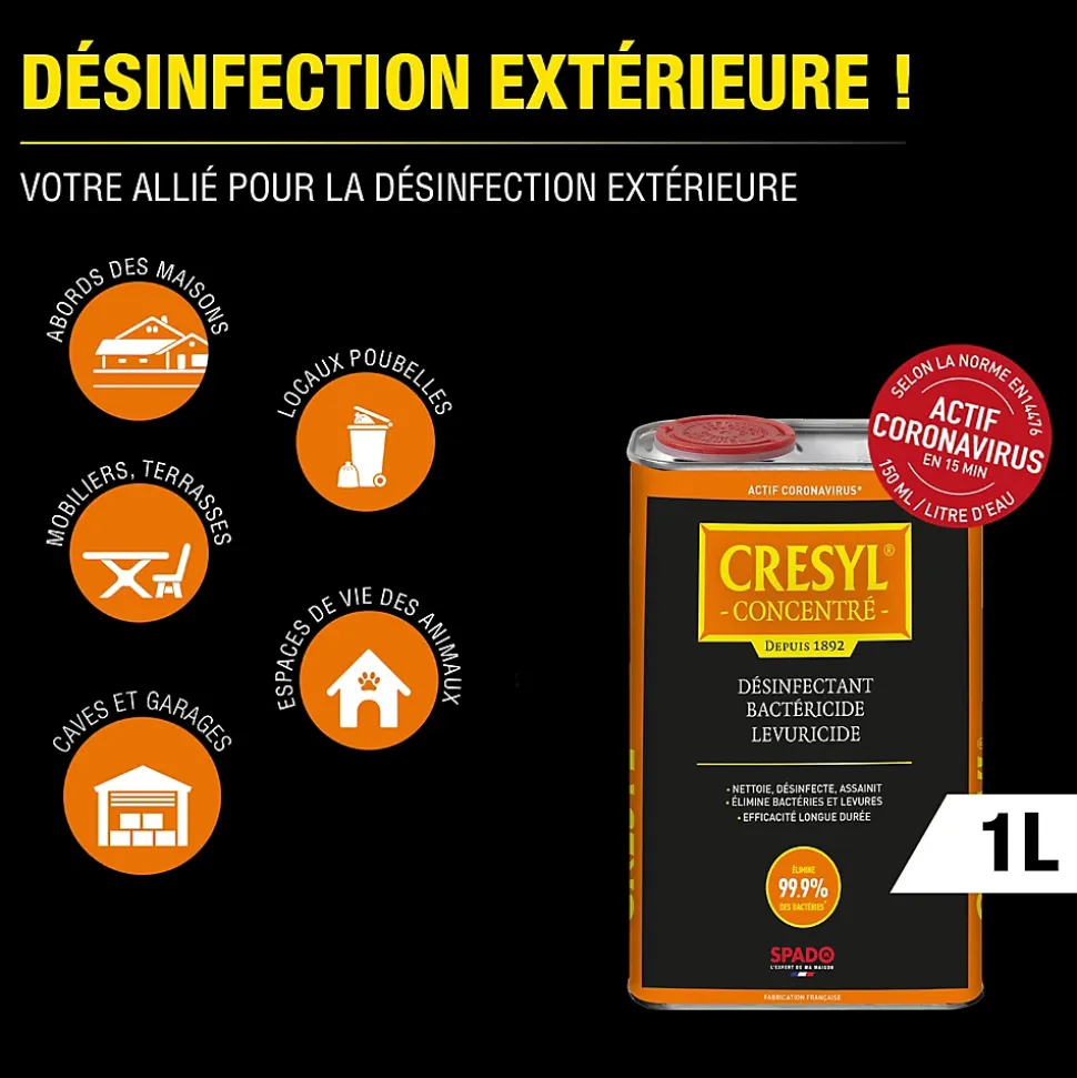 Depuis 1892, CRESYL est le nettoyant désinfectant idéal pour les usines, les collectivités, les lieux publics, l’industrie, le transport, la maison… CRESYL nettoie et désinfecte caves, poubelles ménagères, locaux poubelles, garages, terrasses, abords de la maison, espaces de vie des animaux… Élimine 99,9% des bactéries, levures, virus* (se référer aux normes ci-dessous). Évite la prolifération des microbes et limite le risque de maladies. Ne tache pas et respecte les surfaces Contient un agent amérisant pour la protection des enfants. CRESYL est compatible avec un nettoyeur haute pression. Formule adaptée pour satisfaire aux dernières contraintes environnementales. Fabriqué dans la région lyonnaise, CRESYL respecte les normes européennes : actif à 7% en conditions de saletés sur surfaces dures.