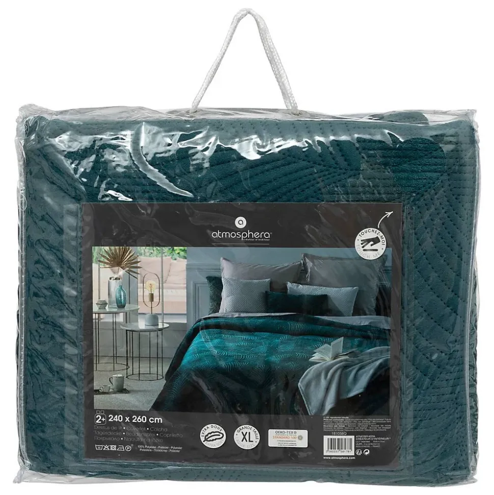 Apportez une note raffinée à votre chambre à coucher avec ce dessus-de-lit « Feuille » Atmosphera ! La tendance végétale Ce dessus-de-lit en velours allie douceur et confort. Agréable au toucher, il conférera aussi un côté cosy à votre literie grâce à son aspect matelassé. Une fois déployés, ses motifs intégrés dans la matière donneront du charme à votre pièce. Associez ce couvre-lit à des draps et des taies d’oreillers Atmosphera aux couleurs contrastées pour personnaliser votre déco. Le petit plus déco Vous pourrez détourner l’usage de ce dessus-de-lit en l’employant pour habiller un canapé ou une banquette à la place d’un plaid classique.Produit labellisé OEKO-TEX