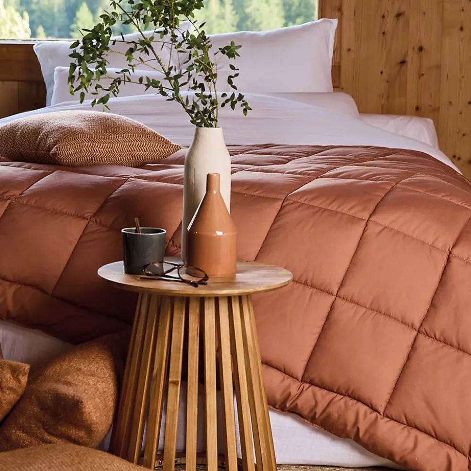 Le dessus de lit LAZY en 100% polyester microfibre effet peau de pêche, avec une finition piquage carreaux et cadre, disponible en orange ocre, vous offrira confort, durabilité et élégance à votre chambre.