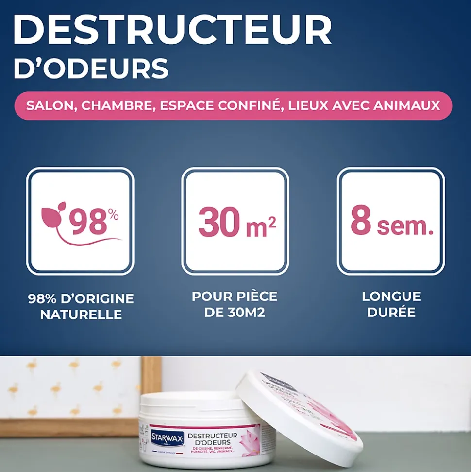 Le destructeur d’odeur élimine les mauvaises odeurs (Cuisine, WC, humidité, animaux). Ouvrir la boite et laisser diffuser : le produit est pleinement actif 24 à 72h après ouverture. Jusqu’à 8 semaines de tranquilité