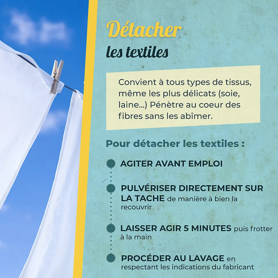 Détachant textile au fiel de boeuf. Si la tâche est tenace, au lieu de frotter à la main, utilisez une brosse à dents ou à ongles usagée. Conditionnement : Liquide. Conseils d’utilisation : Pulvérisez directement sur la tâche. Laissez agir 5 minutes, puis frottez à la main.