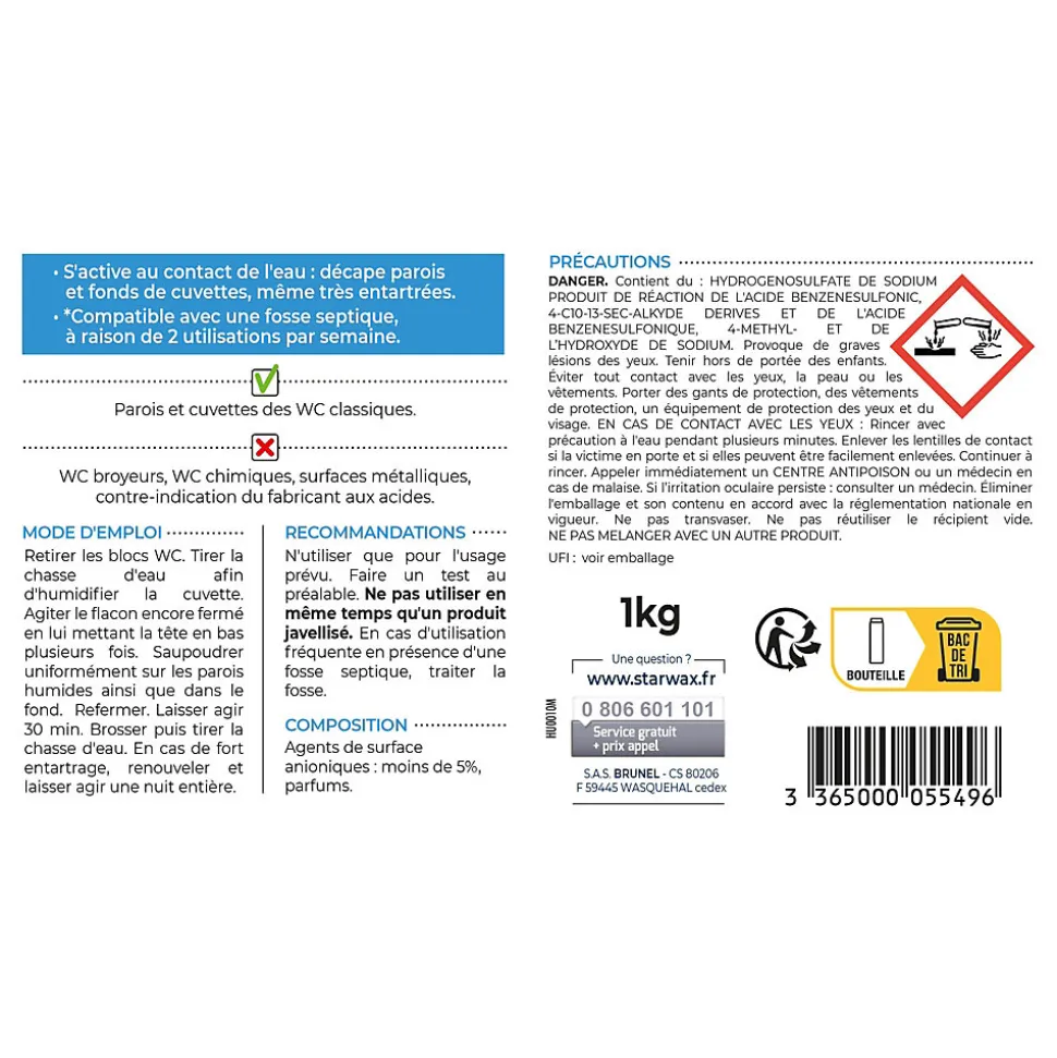 Libère de la soude sulfurique au contact de l’eau. Efficace sur les parois très entartrées mais aussi sur les fonds de cuvette.