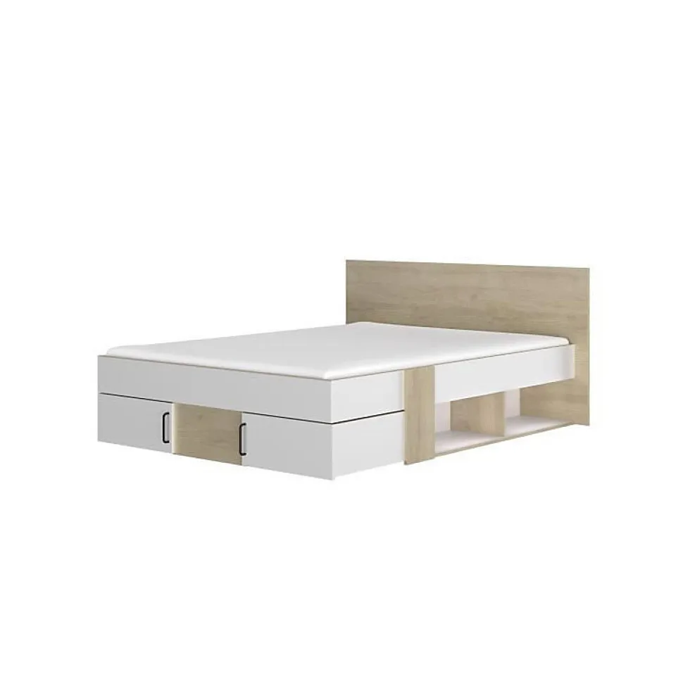 Lit adulte DIAGONE SWIVEL 140 x 190 cm alliant design contemporain et rangement : 2 tiroirs pivotants, 2 casiers latéraux et 2 étagères ouvertes, finition papier décor chêne blond et blanc. Sommier et matelas non inclus. Fabriqué en France, certification Origine France Garantie FCBA1607100, garantie pièces 2 ans.