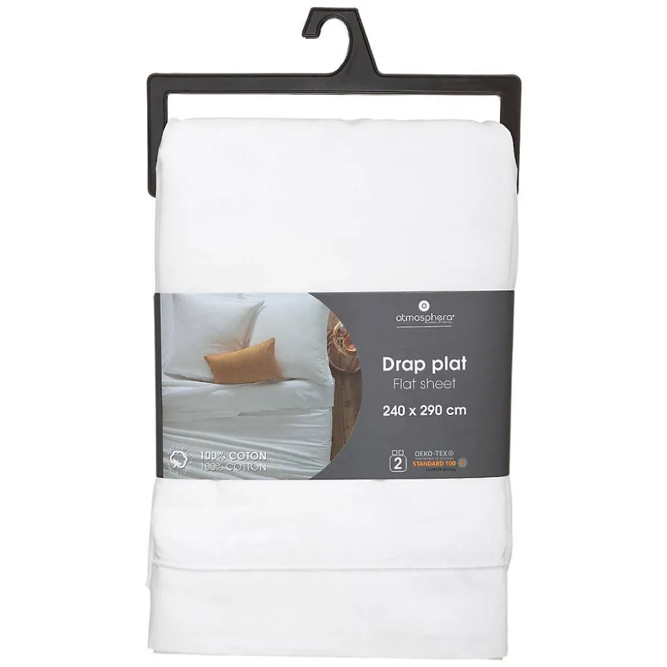 Laissez-vous séduire par le drap plat en coton Atmosphera.Doux et légerCe drap uni deux personnes existe dans une large gamme de couleurs. En coton, cette matière résistante et respirante vous offrira des nuits parfaitement sereines. Choisissez la couleur de vos rêves parmi tous les coloris de la gamme.Selon votre inspiration, associez votre drap à une housse de couette et des taies d’oreiller assorties, contrastantes ou imprimées Atmosphera.Produit labellisé OEKO-TEX