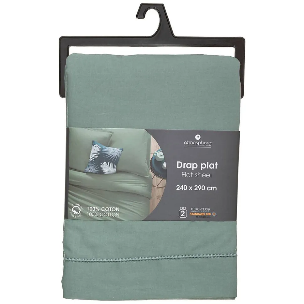 Laissez-vous séduire par le drap plat en coton Atmosphera.Doux et légerCe drap uni deux personnes existe dans une large gamme de couleurs. En coton, cette matière résistante et respirante vous offrira des nuits parfaitement sereines. Choisissez la couleur de vos rêves parmi tous les coloris de la gamme.Selon votre inspiration, associez votre drap à une housse de couette et des taies d’oreiller assorties, contrastantes ou imprimées Atmosphera.Produit labellisé OEKO-TEX