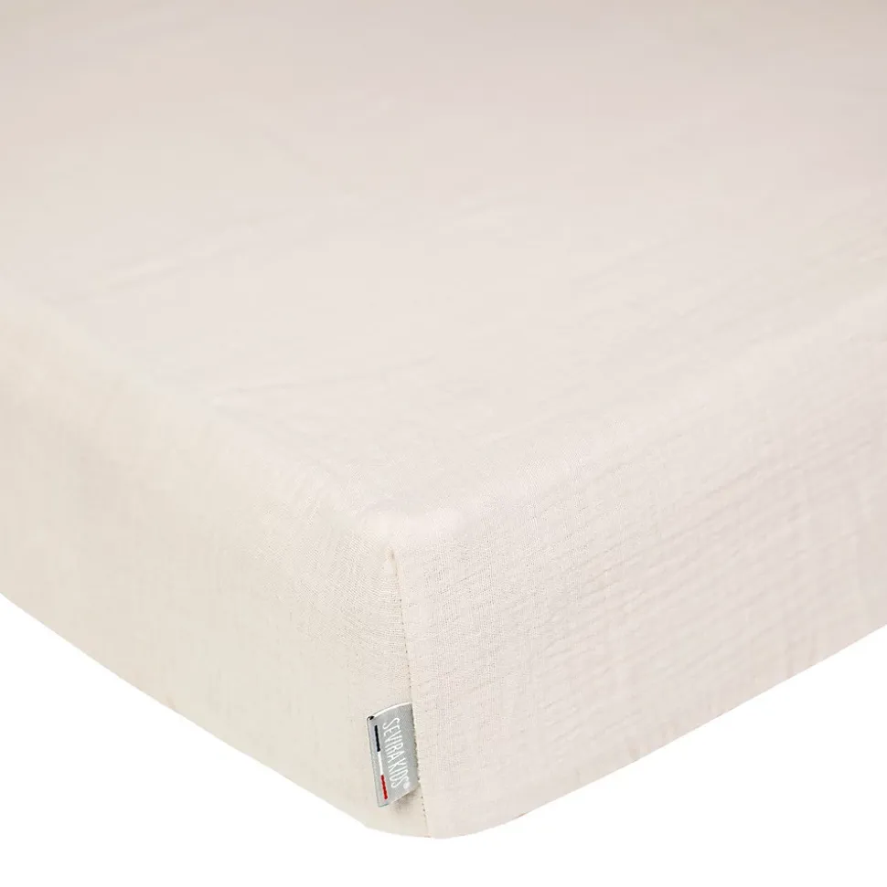 - Drap housse en gaze de coton, doux, respirant et certifié Oeko-Tex, idéal pour respecter la peau sensible de bébé.
