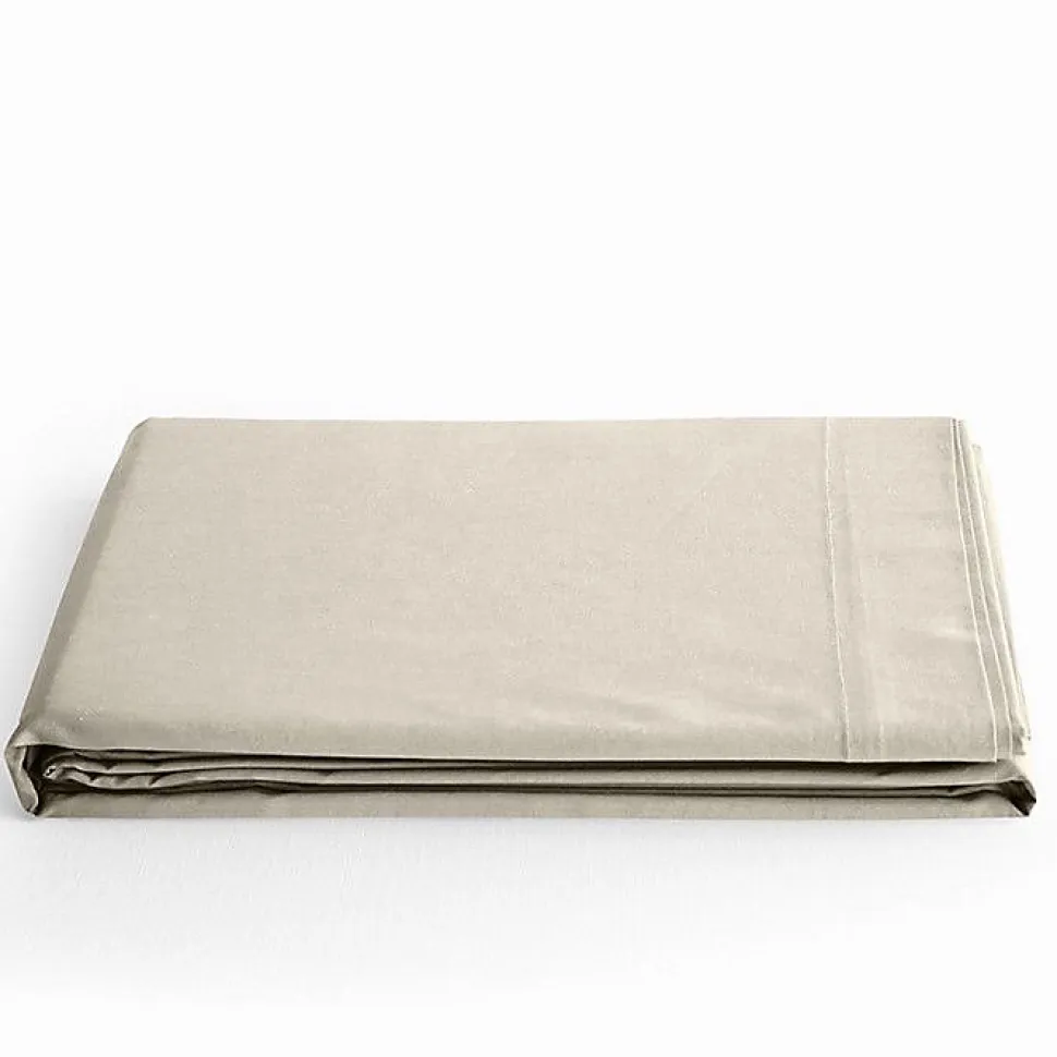 Drap plat Premium 100% coton 57 fils/cm² — douceur et tenue supérieures. Disponible en 180 x 290 cm (1 place) et 240 x 300 cm (2 places). Couleur Sable uni. Certifié Oeko-Tex. Entretien simple, lavage à 40°.