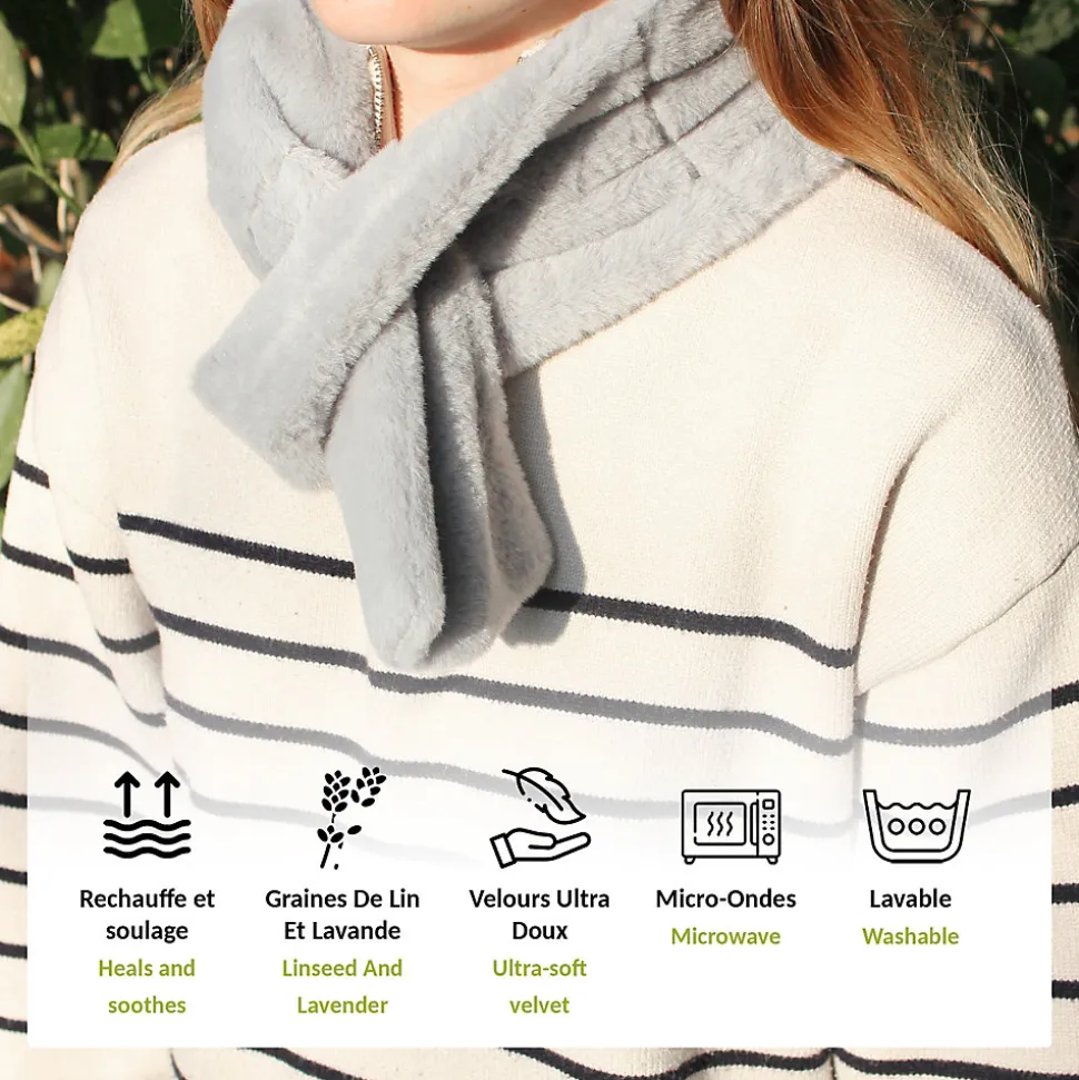 CONFORT – Réchauffez-vous en un clin d’œil ! Il suffit de placer l’écharpe au micro-ondes pour profiter d’une chaleur douce et durable, grâce aux graines de lin qui emmagasinent et diffusent la chaleur lentement.PARFUM – Enrichie de fleurs de lavande séchées, cette écharpe dégage un doux parfum relaxant une fois chauffée, pour une sensation de bien-être incomparable.DOUCEUR – Confectionnée en velours ultra doux, elle est agréable à porter et reste bien en place autour du cou grâce à son passant discret.ENTRETIEN – Sa housse amovible se lave en machine, garantissant une utilisation hygiénique et durable au fil du temps.CARACTERISTIQUES – Matières : textile velours polyester – Dimensions : 86 x 12 x 2.5 cm – Garniture: 97% graines de lin 3% fleurs séchées de lavande – Housse amovible et lavable à 30° – Certifiée AZO – Livrée sous polybag