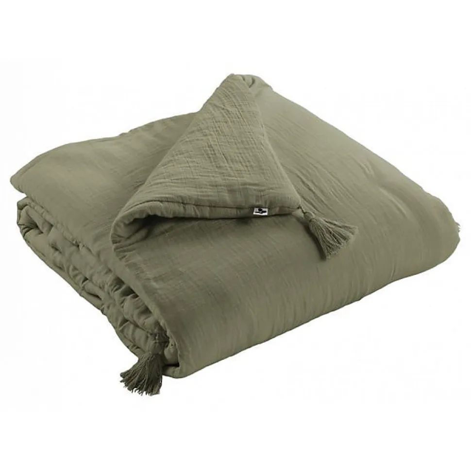 Edredon ou bout de lit Gaïa en double gaze de coton, matière légère, souple et très douce, tombé vaporeux, finitions avec petites surpiqûres et 4 pompons, lavable en machine à 30°C, sans sèche-linge, label DETOX TO ZERO by OEKO-TEX.
