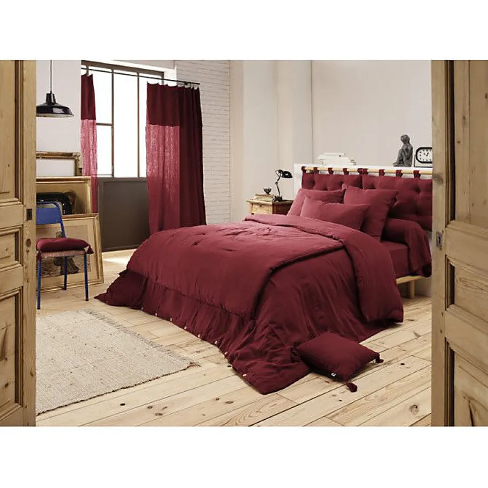 Caracteristiques du produit**Double gaze de coton** pour un toucher ultra doux et aérien, **légère et respirante** idéale toute l’année**Finitions soignées** avec petites surpiqûres pour maintenir le garnissage et 4 pompons décoratifs **Description matiere**La double gaze de coton est composée de deux fines épaisseurs de coton au tissage aéré offrant un tombé vaporeux, une grande souplesse et une excellente respirabilité. Elle procure une sensation de confort et de douceur au contact.**Design et utilisations**Conçu comme edredon ou bout de lit, ce modèle Gaïa apporte une touche décorative chaleureuse et s’harmonise avec la gamme (housses de couette, taies, draps housses) pour une literie coordonnée. Disponible en plusieurs dimensions pour s’adapter à tous les lits.**Dimensions et options**Existe en 90 x 200 cm (bout de lit), 150 x 150 cm et 180 x 240 cm (edredons). Plusieurs coloris disponibles dont bordeaux/lie de vin pour une finition élégante.**Entretien et durabilité**Matière délicatement gaufrée qui ne nécessite pas de repassage, s’embellit au fil des lavages. Lavage en machine à 30° recommandé, éviter le sèche-linge pour préserver la texture.
