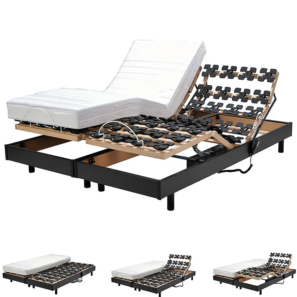 Lot de 2 Sommiers relaxations électriques FLEXPALACE 80 x 200 cm + 2 Matelas mémoire de formeStructure en MDF section 125 x 22 mm noirTraverses en hêtre massif10 rangées de plots, avec 160 points de soutienZone bassin réglable à l’aide de 8 raidisseursHauteur sous pan : 15 cmMoteurs électriques très puissants : 2 x 4500 NewtonRéglages individuels par télécommande 6 touchesRéglages indépendants de la tête et des piedsRemise à zéro automatique en cas de coupure de courant pour plus de sécurité5 plans de couchage adaptés à la morphologie pour choisir sa position idéale8 pieds cylindriques de hauteur 15 cm fournis.A monter soi mêmeLivré avec 2 matelas mémoires de forme 80 x 200 cm :Housse : Tissu polyester de 150g ouatinée avec 150g/m² de fibresDéhoussable sur 4 cotés, pour pouvoir être lavé dans une machine à laver classique plateau par plateau à 60°.Cette température de lavage permet d’éliminer les acariens.Epaisseur du matelas : 18 cmSoutien ferme et accueil moelleux.Cœur de 17 cm composé de : – 15 cm de mousse HD 25kg/m3 et 4.2kpa – 2 cm de mousse visco élastique de 30kg/m3Livré enroulé et comprimé. Attendre minimum 48h pour que le matelas reprenne sa forme initiale.Nos sommiers sont déconseillés aux personnes de forte corpulence. Ils ont été conçus et testés dans le cadre dune utilisation quotidienne par une personne de poids maximum de 100 Kg.Dimensions:200x156x33