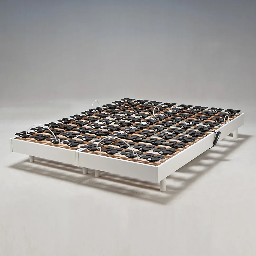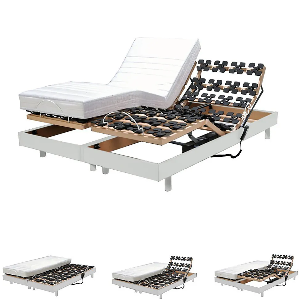 Lot de 2 Sommiers relaxations électriques FLEXPALACE 80 x 200 cmStructure en MDF section 125 x 22 mm blancTraverses en hêtre massif10 rangées de plots, avec 160 points de soutienZone bassin réglable à l’aide de 8 raidisseursHauteur sous pan : 15 cmMoteurs électriques très puissants : 2 x 4500 NewtonRéglages individuels par télécommande 6 touchesRéglages indépendants de la tête et des piedsRemise à zéro automatique en cas de coupure de courant pour plus de sécurité5 plans de couchage adaptés à la morphologie pour choisir sa position idéale8 pieds cylindriques de hauteur 15 cm fournis.Livré sans matelas, A monter soi-mêmeNos sommiers sont déconseillés aux personnes de forte corpulence. Ils ont été conçus et testés dans le cadre dune utilisation quotidienne par une personne de poids maximum de 100 Kg.La photo représente 2 sommiers 80×200 côte à côte.Possibilité de commander le sommier 80×200 seul.Dimensions:200x156x33