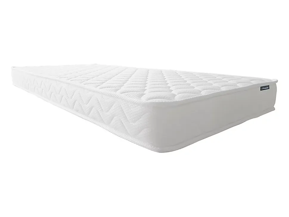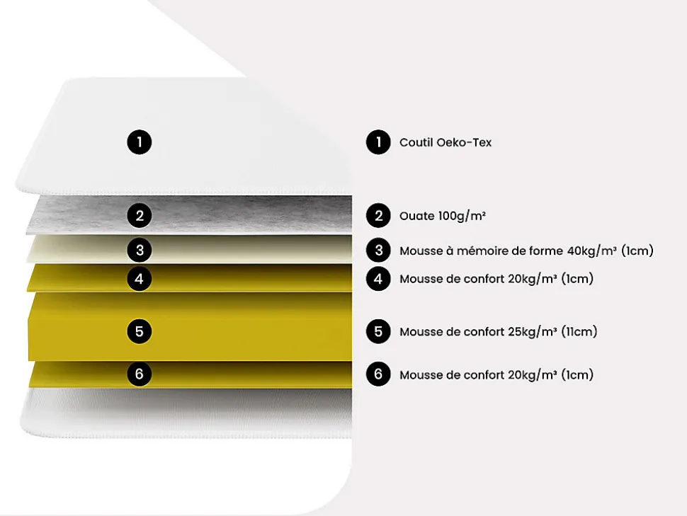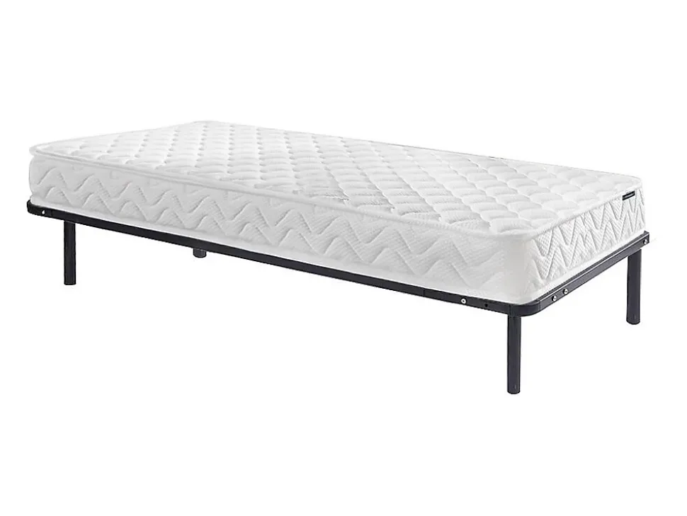 Un sommeil réparateur sans dépasser votre budget1 x Matelas classique PELOPSCaractéristiques Technologie (âme) : Mousse Soutien : Ferme Densité (âme) : 25 kg/m³ Technologie matelas (accueil) : Mousse à mémoire de forme Densité (accueil) : 40 kg/m³ Accueil : Enveloppant Garnissage du matelas : Ouate Densité (garnissage) : 100 g/m2 Coutil (matière) : Polyester Couleur (nuance) : Blanc Matière (précision) : 100 % Polyester Taille (couchage) : 90 x 190 cm Nombre de places : 1 place Garantie : 5 ans Compressé/roulé : Compressé/rouléDimensions Longueur : 190 cm Hauteur : 15 cm Profondeur : 90 cm Epaisseur matelas : 15 cm Hauteur de l’âme : 11 cm Epaisseur mémoire de forme : 1 cm1 x Cadre à lattes KALISTACaractéristiques Couleur (nuance) : Noir Matière (précision) : Métal Epaisseur métal : 1.2 mm Taille (couchage) : 90 x 190 cm Nombre de places : 1 place Sans pieds Technologie (sommier) : Lattes actives Nombre de lattes : 19 lattes Matière des lattes : Bois (peuplier) Charge maximale supportée : 200 kg À monter soi-même : Cadre métal laqué epoxy cintré sur chantDimensions Longueur : 188 cm Hauteur : 5 cm Profondeur : 88 cm1 x Lot de 4 pieds cylindriques pour cadre à lattes – Noirs – BOLGARECaractéristiques Couleur (nuance) : Noir Matière (précision) : Métal Avec piedsDimensions Longueur : 3.8 cm Hauteur : 25 cm Profondeur : 3.8 cmLivraisonLors de la livraison, il est conseillé de vérifier que le bon nombre de colis a été livré.Colis1 x Matelas classique PELOPSColis n°1 : Longueur 95 cm, Largeur 28 cm, Hauteur 28 cm, Poids 8 kg. 1 x Cadre à lattes KALISTAColis n°1 : Longueur 182 cm, Largeur 30 cm, Hauteur 7 cm, Poids 12 kg. 1 x Lot de 4 pieds cylindriques pour cadre à lattes – Noirs – BOLGAREColis n°1 : Longueur 31 cm, Largeur 27 cm, Hauteur 5 cm, Poids 1 kg.