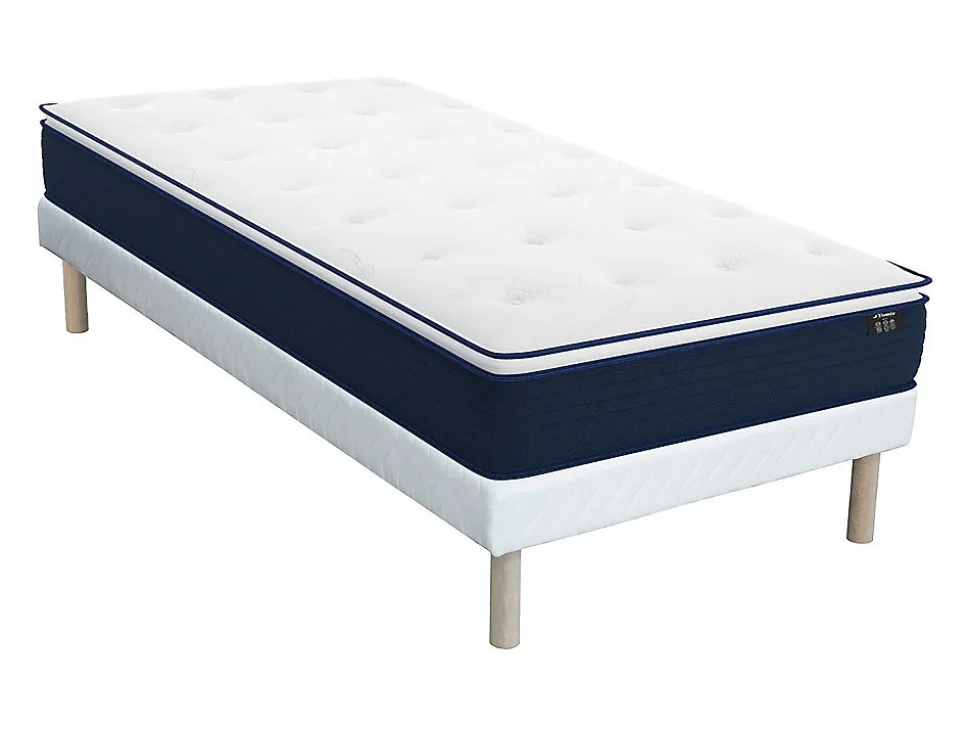 Le matelas ALTIER ressorts ensachés avec surmatelas intégré en mousse alvéolée allie soutien très ferme et accueil tonique pour un plus grand confort.1 x Matelas classique ALTIERCaractéristiques Technologie (âme) : Ressorts ensachés Nombre de ressorts (matelas) : 420 Soutien : Très Ferme Technologie matelas (accueil) : Mousse alvéolée Densité (accueil) : 20 kg/m³ Accueil : Moelleux Coutil (matière) : Coutil stretch Couleur (nuance) : Blanc Matière (précision) : 100 % Polyester Taille (couchage) : 90 x 190 cm Nombre de places : 1 place Avec ou sans surmatelas : Avec surmatelas Gamme : Espace pro Garantie : 5 ans Compressé/roulé : Compressé/rouléDimensions Longueur : 190 cm Hauteur : 24 cm Profondeur : 90 cm Epaisseur matelas : 24 cm Hauteur de l’âme : 18 cm1 x Sommier tapissier ASTHENISCaractéristiques Couleur (nuance) : Blanc Matière (précision) : 100 % Polyester Matière (Piètement) : Bois Structure : Bois Taille (couchage) : 90 x 190 cm Nombre de places : 1 place Avec pieds Technologie (sommier) : Lattes passives Nombre de lattes : 9 lattes Matière des lattes : Bois (épicéa) Gamme : Good for Planet Produit : PEFC, Fabriqué en France Charge maximale supportée : 100 kg Livré monté (sauf pieds et/ou poignées)Dimensions Longueur : 190 cm Hauteur : 31 cm Profondeur : 90 cm Hauteur des pieds : 20 cmLivraisonLors de la livraison, il est conseillé de vérifier que le bon nombre de colis a été livré.Colis1 x Matelas classique ALTIERColis n°1 : Longueur 100 cm, Largeur 32 cm, Hauteur 32 cm, Poids 21 kg. 1 x Sommier tapissier ASTHENISColis n°1 : Longueur 190 cm, Largeur 90 cm, Hauteur 12 cm, Poids 13 kg.
