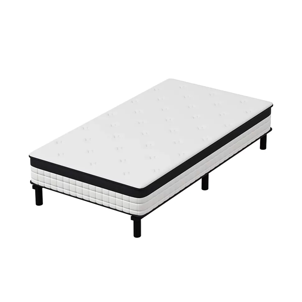 Description du produit:Epaisseur du matelas : 18cmHauteur des pieds en plastique : 16,5 cmNombre de pieds en plastique : 6Structure : ① tissu tricoté : 1cm de mousse matelassée ; 1cm de mousse matelassée bleue ; ② tissu couleur naturelle : 1cm de mousse haute densité ; ③ feutre de coton : 15cm de ressorts ensachés de 1,9mm ; ④ feutre de coton : non-tissé rigide bord inférieur : tissu (noir 3D + blanc tricoté) 0,8cm de mousse matelassée.Matériau des lattes : fer1. taille : matelas à ressorts 90x200x18CM, avec cadre de lit en fer robuste 90x200CM, avec pieds, lattes et vis. 2. stabilité et durabilité : le dos du matelas est incrusté de planches de bois soutenues par 6 pieds robustes en plastique naturel avec patins antidérapants ;2. stabilité et durabilité : le matelas est incrusté de planches de bois robustes à l’arrière, soutenu par 6 pieds robustes en plastique naturel avec des patins antidérapants, et des traverses métalliques des deux côtés renforcent la stabilité et la sécurité du lit ; la hauteur du cadre de lit par rapport au sol est de 16,5 cm, ce qui peut être utilisé comme espace de rangement pour faciliter le nettoyage et permettre aux aspirateurs robotisés de passer facilement.3. assurer un sommeil confortable : la structure à 7 zones est adoptée pour offrir un meilleur soutien ; elle est fabriquée à partir de matériaux certifiés, exempts de substances nocives telles que le formaldéhyde, le mercure, d’autres métaux lourds, etc. le tissu enduit sur la surface du matelas favorise la circulation de l’air, est facile à entretenir et respirant, et le couvre-lit en tissu tricoté a une meilleure sensation au toucher pour permettre au matelas de respirer, de dissiper la chaleur et d’absorber l’humidité.4) Facile à installer