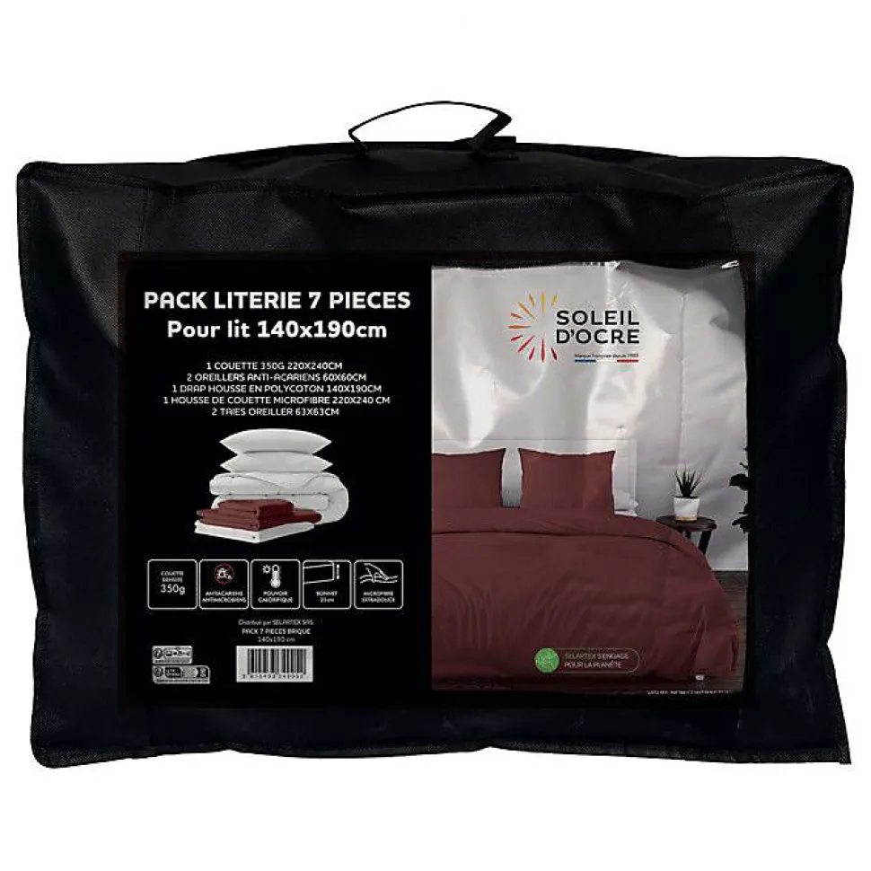 Pack complet de literie pour lit 2 places en 140×190 cm (7 Pieces). Prix malin. Couleur: Brique. Se compose de: – 1 Couette blanche DOUCEUR 220×240 cm (Enveloppe: microfibre, 350 gr). – 2 Oreillers blancs CONFORT 60×60 cm Anti-acarien (Enveloppe: microfibre, Garnissage: fibre creuse siliconnée 550 Gr). – 1 Drap housse 140×190 cm ZZZ blanc (55% polyester, 45% coton), Bonnet de 25 cm.. – 1 Housse de couette brique 240