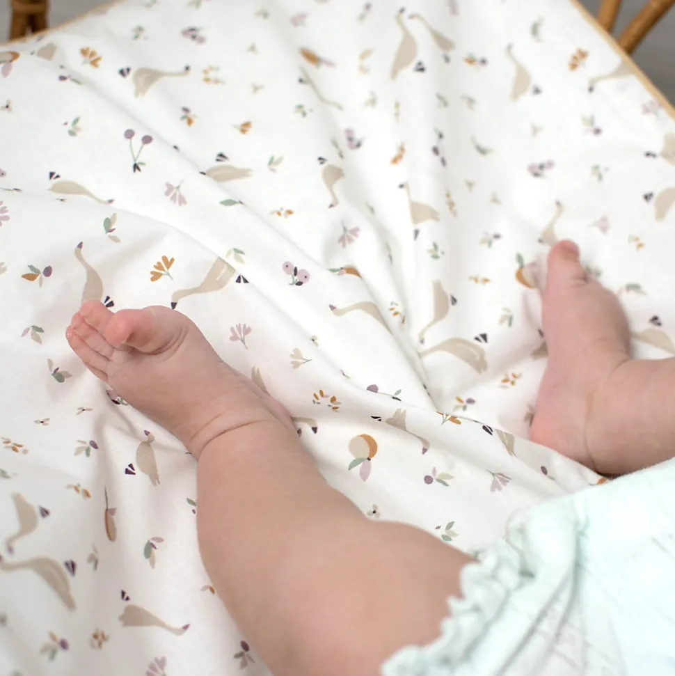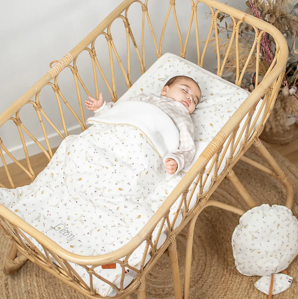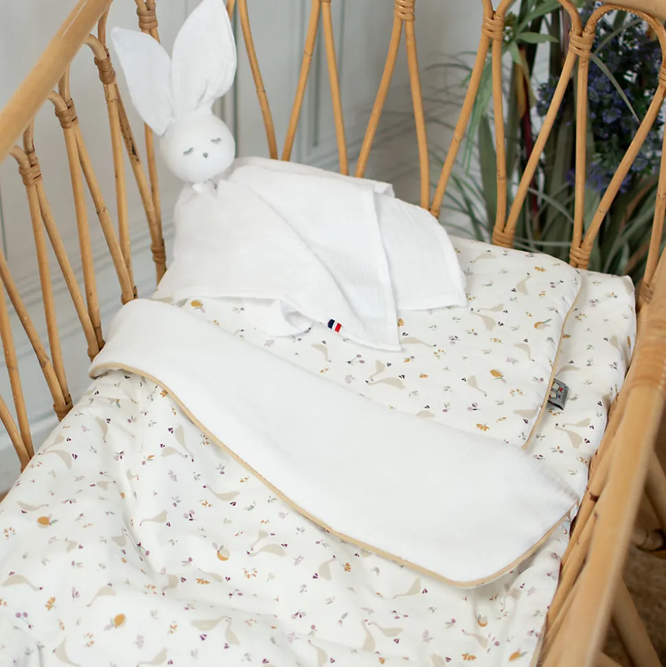 Offrez à bébé un sommeil paisible avec l’ensemble couverture et coussin Sidonia, réversible et légèrement ouatiné. Un côté en coton imprimé champêtre avec de délicates petites oies, baies et fleurs minimalistes, et l’autre en gaze de coton unie. Idéal pour berceau, couffin et panier Moïse. Fabrication française, Oeko-Tex.