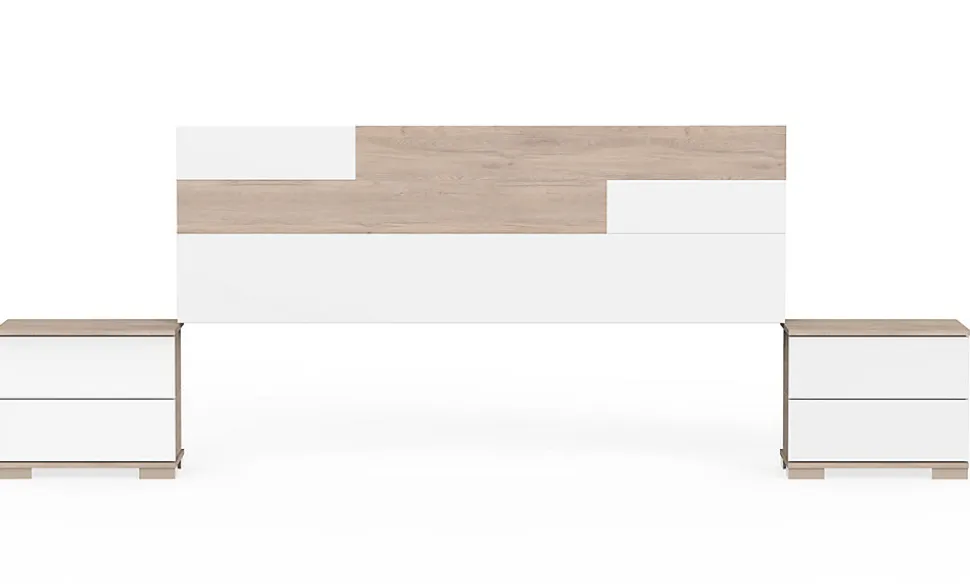 Ensemble de chambre à coucher adulte coloris effet bois / blanc composé de : – Armoire de rangement, en panneaux de particules et mélamine haute densité coloris effet bois / blanc, avec 2 portes coulissantes. – Ensemble 2 tables de chevet + tête de lit coloris effet bois / blanc en panneaux de particules et mélamine haute densité. Tête de lit livrée avec la quincaillerie pour accrocher au mur. Lit, sommier et matelas non inclus Produit de fabrication Espagnol certifié PEFC. Livré en kit. Dimensions armoire : Hauteur 200 x Longueur 150 x Profondeur 62 cm Dimensions des étagères : Hauteur 46 x Longueur 72,5 x Profondeur 53 cm Dimensions totales ensemble : Hauteur 105 x Longueur 212 x Profondeur 36 cm Tête de lit : Hauteur 55 x Longueur 170 x Profondeur 1.6 cm Tables de chevet : Hauteur 42 x Longueur 50 x Profondeur 34 cm Mesures intérieures du tiroir : hauteur 13 x Longueur 40 x profondeur 28,5 cm Hauteur pieds : 3 cm Matière : panneaux de particules et mélamine haute densité Coloris : effet bois / Blanc Poids : 153 KG
