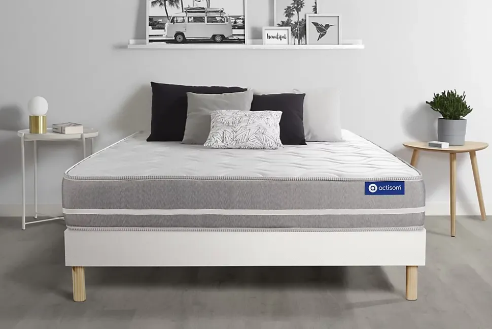 ACTISOM est une marque française développée en partenariat avec les plus grands experts européens du sommeil et de la literie. Après plusieurs années de recherche et de développement, nous avons mis au point des technologies innovantes (Actisoft – Actifresh – Acticell) afin de vous garantir d’excellentes nuits de sommeil. Tous nos matelas sont garantis 7ans et leur fabrication bénéficie d’un contrôle qualité très performant. Nos usines respectent les normes technologiques et environnementales européennes en vigueur.L’avis de notre expert: le matelas Actilatex TOUCH bénéficie d’un confort équilibré. Il est composé de 3 technologies : Latex, mousse Actisoft et mousse à mémoire de forme qui épouse les formes naturelles du corps et contribue à soulager les points de pression. Cette association de technologies permet de bénéficier d’une parfaite indépendance de couchage. Elle vous assure donc une totale liberté de mouvement.• Epaisseur 20 cm• Plateau pour les 2 faces 3cm Latex + Mousse polyuréthane à mémoire de forme + mousse polyuréthane actiSoft• Bloc mousse polyuréthane haute densité 14cm• Coutil 100% polyester micro-perforé ultra respirable• Confort Equilibré• Type de sommier : Tapissier à lattes démontable à assembler soi même• Épaisseur : 14 cm• Structure et traverses de renfort en pin massif• 2×15 lattes multiplis• Garnissage fibres 100% polyester 120G/M2• Tissu maille 100% polyester 260G/M2• Pieds : Bois 15cm fournis• Montage facile : le montage pourra être effectué par une personne seule en seulement 10 minutes • Epaisseur 20 cm• Plateau pour les 2 faces 3cm Latex + Mousse polyuréthane à mémoire de forme + mousse polyuréthane actiSoft• Bloc mousse polyuréthane haute densité 14cm• Coutil 100% polyester micro-perforé ultra respirable• Confort Equilibré• Type de sommier : Tapissier à lattes démontable à assembler soi même• Épaisseur : 14 cm• Struc