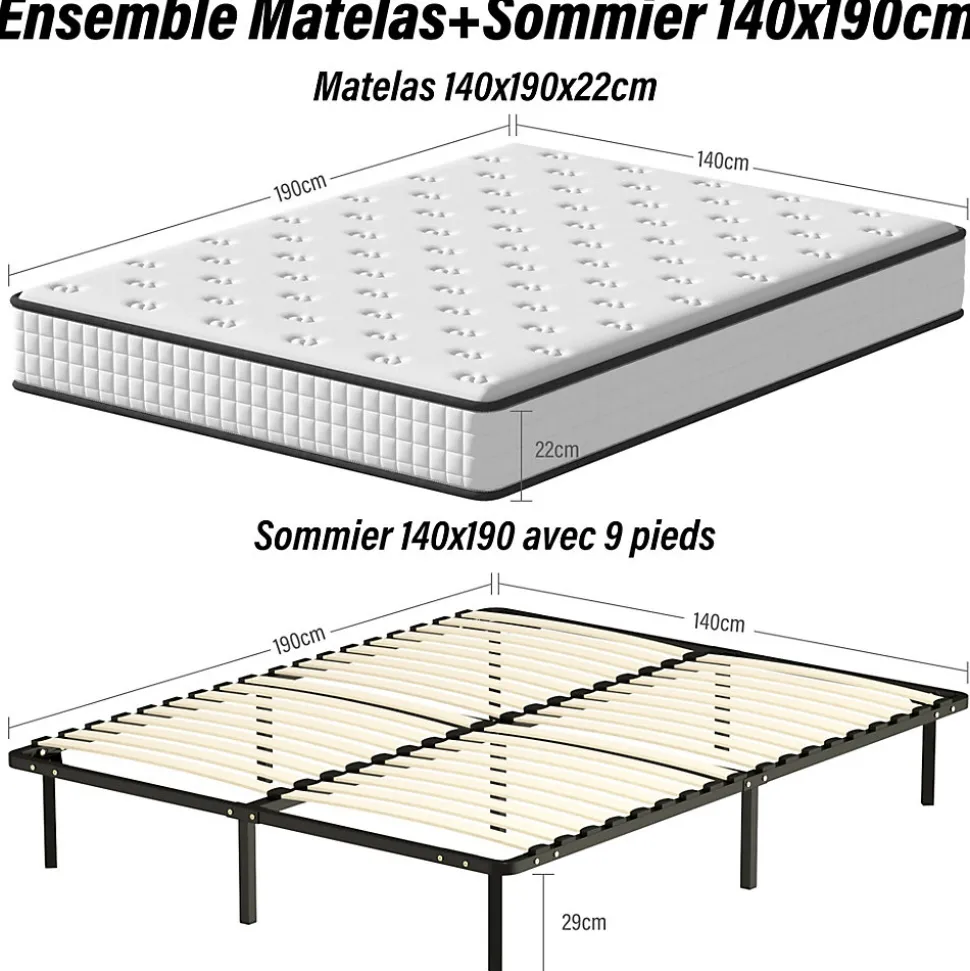 Dimensions du matelas et du cadre de lit: 140 x 190 cm, mousse de polyuréthane haute densité, matelas livré alvéolé et comprimé, cellules fermées – densité 30kgm3 et 1 cm de mousse à mémoire de forme, bandes tridimensionnelles autour du matelas pour une meilleure respirabilité. Le matelas épouse les formes de votre corps, répartit uniformément la pression et offre un grand confort quelle que soit votre position de sommeil.Sommier à lattes : dimensions 140 x 190 cm, hauteur 26 cm, ergonomique, livré avec 7 pieds de lit dévissables, dont 1 pied central pour plus de stabilité. Le sommier à lattes présente une distance plus faible entre les extrémités et le sol, ce qui rend le réseau plus résistant à la pression et lui confère une durée de vie plus longue.Certifications et normes Afin de garantir la qualité des matelas et la qualité des matériaux utilisés pour leur fabrication, les matelas que nous proposons sont certifiés et réglementés par les normes les plus importantes de l’industrie textile, garantissant la qualité et la sécurité : certificat Oeko-tex Trusted Textile, système de qualité, certification ISO 9001, etc.Si vous n’êtes pas satisfait pour quelque raison que ce soit, veuillez nous contacter immédiatement. Attendez 48 à 72 heures pour rétablir l’état d’origine. Fermeté du matelas : Moyennement fermeMatériau de rembourrage : MousseHypoallergénique : OuiHauteur du matelas (cm) : 22Housse amovible : nonDuplex (été/hiver) : OuiDimensions du matelas à déplier : 140x190x22cmLongueur de l’emballage du matelas : 80cmTaille de l’emballage du matelas : 39cmTaille de l’emballage du matelas : 38cmPoids du paquet de matelas : 17,5 kgAvis:1.Veuillez prévoir 48 à 72 heures pour que le matelas reprenne sa forme d’origine.2.En raison de la