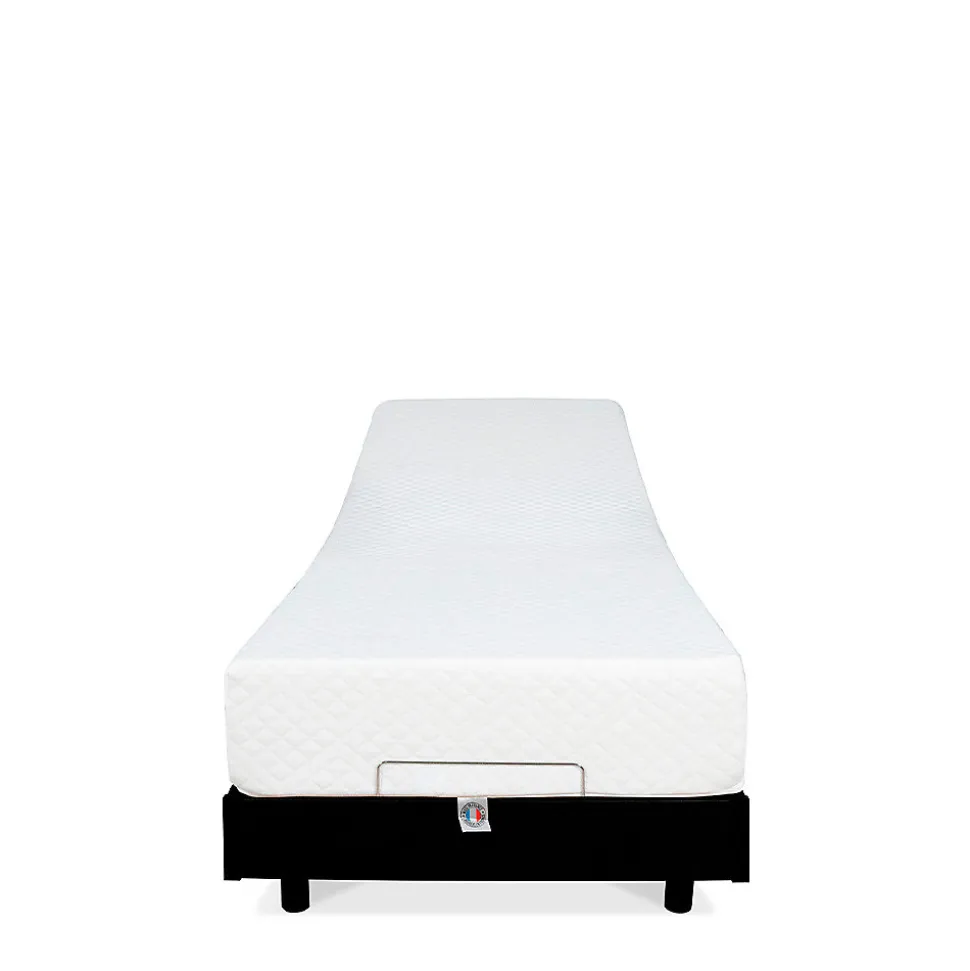 SommierCARACTERISTIQUES :Type de sommier : ElectriqueSuspension : LattesDimensions disponibles (cm) : 70×190 – 70×200 – 80×190 – 80×200 – 90×190 – 90x200Hauteur (pieds montés) : 27 cmEpaisseur du cadre : 12 cmHauteur des pieds : 15 cmNombre de pieds : 4Nombre de lattes : 26Composition : Lattes et cadre mobile en bois multiplis – Caisse en bois MDF – Pieds en boisFonctionnement : Avec télécommande filaireGarantie : Structure 5 ans – Moteur 2 ansLivré à platPOINTS FORTS :Confort sur-mesure (fonction relevage tête, buste et/ou jambes + renforts lombaires avec curseurs de fermeté)Sécurité (butées d’arrêt matelas)Autonomie (fonction relais en cas de coupure de courant)RobusteIntégrable dans un cadre de litMatelasCARACTERISTIQUES :Dimensions disponibles (cm) : 70×190 – 70×200 – 80×190 – 80×200 – 90×190 – 90x200Epaisseur : 21 cmTechnologie : Mémoire de formeAccueil : ToniqueSoutien : FermeIndépendance de couchage : 4/5Aération : 4/5Garantie : 10 ansDéhoussableLivré rouléCOMPOSITION :Âme intérieure (CertiPUR) : 18 cm de mousse Haute Densité de 28 kg/m³ + 3 cm de mousse viscoélastique à mémoire de forme de 50 kg/m³Coutil (Oeko-Tex) : Tissu stretch 100 % PES de 300 gr/m²POINTS FORTS :ErgonomieSoutien