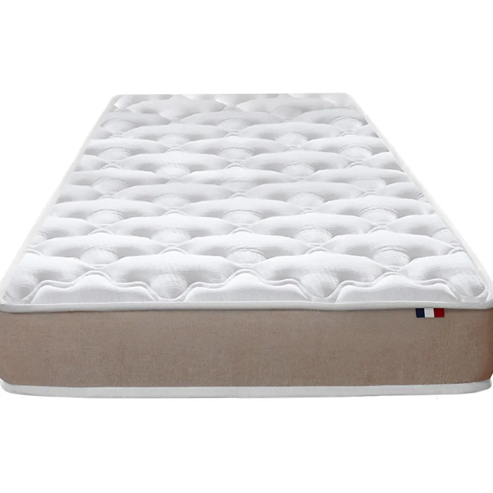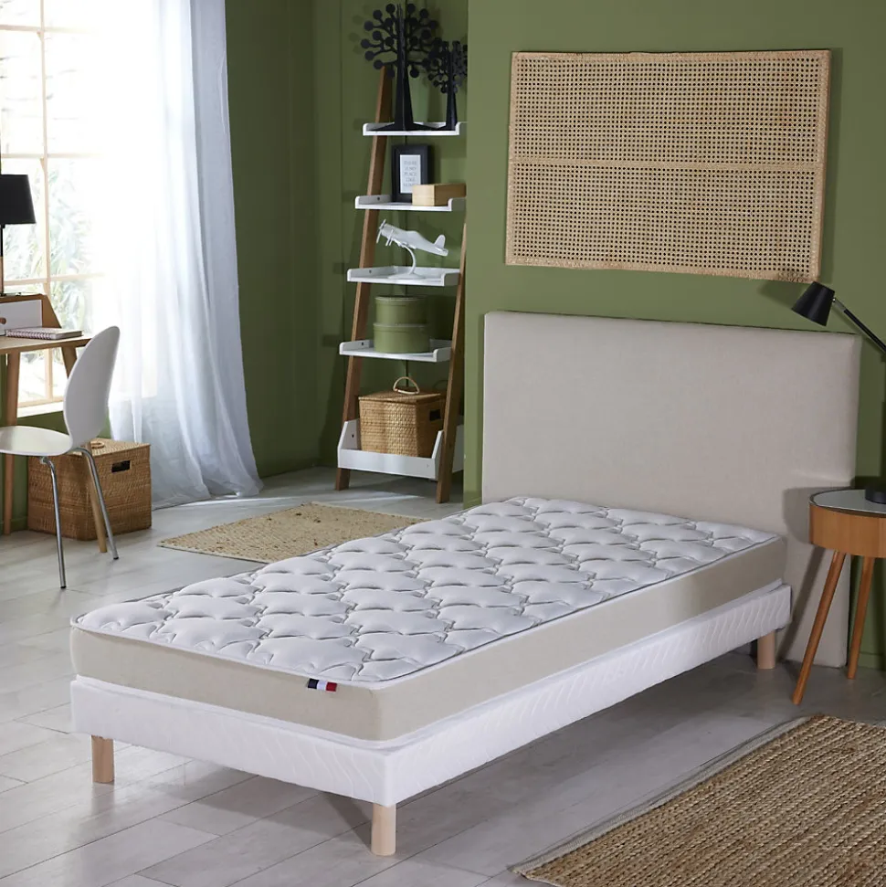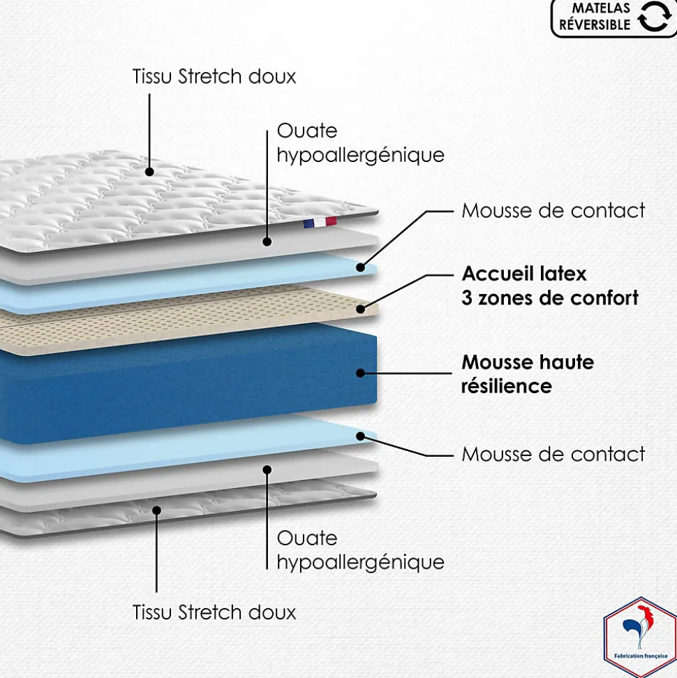 Matelas Accueil Latex 3 zones + Mousse Haute Résilience (durable, souple et rigide à la fois ; une des meilleures du marché) matelas avec accueil latex Il épouse les formes de votre corps pour votre plus grand confort. Vos muscles se relâchent et une sensation d’apesanteur vous envahit pour des nuits paisibles. Caractéristiques : Épaisseur : 18 cm Soutien : Ferme Accueil : Moelleux Composition : Matelas Bi-confort : 1 face latex alvéolé plus enveloppant et respirant (côté bandeau) / 1 face mousse HR plus ferme Ame : 2 cm de latex 60 kg et 12 cm de mousse Haute Résilience 35kg/m3 LATEX : Il faut savoir que le matelas en latex est parmi les matelas les plus aérés. C’est un très bon régulateur de chaleur et d’humidité. Grâce à sa densité, vous obtenez un matelas ferme et un bon soutien. L’indépendance de couchage est également parfaite grâce à un soutien souple et précis. C’est une matière résistante et très confortable. Il est fabriqué à partir de la sève d’hévéa Face hiver : 400 g/m2 ouate polyester hypoallergénique & 2cm de latex de zones de confort différenciées (côté bandeau) Face été : 400 g/m2 ouate polyester hypoallergénique Coutil : Stretch 100 % polyester Traitement : pour une hygiène parfaite, le tissu est traité anti-acariens, antibactériens et hypoallergénique Face de couchage : traitement biocide : 2-octyl-2H-Isothiazol-3-one (26530-20-1) / Fatty alcohol C12-C15 ethoxylated (68131-39-5). Tous nos tissus et mousses sont certifiés par Oeko-Tex. Ce matelas dispose de 2 faces de couchage, pensez à retourner votre matelas tous les 6 mois et à inverser tête et pieds tous les 3 mois pour optimiser sa durée de vie au maximum ! L’utilisation d’un protège-matelas + drap-housse permet également d’assurer à votre literie une protection optimale. Matelas Fabriqué en France Garantie 5 ans Livré roulé Sommier Qu’il soit à lattes ou à ressorts, le sommier supporte un tiers du poids et des mouvements