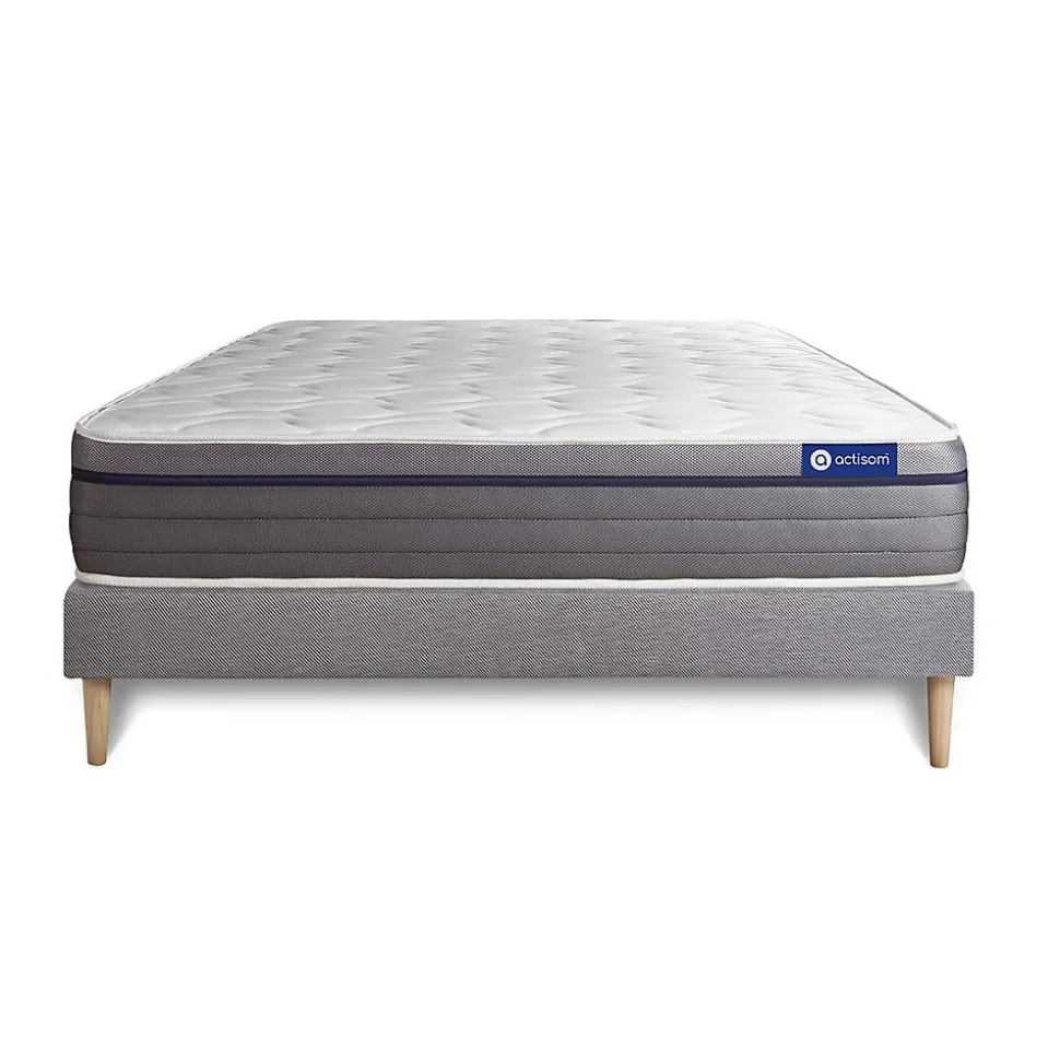 ACTISOM est une marque française développée en partenariat avec les plus grands experts européens du sommeil et de la literie. Après plusieurs années de recherche et de développement, nous avons mis au point des technologies innovantes (Actisoft – Actifresh – Acticell) afin de vous garantir d’excellentes nuits de sommeil. Tous nos matelas sont garantis 7ans et leur fabrication bénéficie d’un contrôle qualité très performant. Nos usines respectent les normes technologiques et environnementales européennes en vigueur.L’avis de notre expert: Le matelas Actimemo ZEN dispose d’une maxi épaisseur de 26cm. Son accueil enveloppant à mémoire de forme, sur les deux faces été/hiver, allège les points de pressions. Son âme en mousse haute densité dotée de 7zones de confort apporte un soutien ferme, idéal pour le bon maintien de votre dos. Il dispose de la technologie ActiFresh qui optimise l’hygiène du matelas.Epaisseur 26 cmPlateau pour les 2 faces 2,5cm Mousse polyuréthane à mémoire de forme + mousse polyuréthane actiSoftSoutien en mousse polyuréthane haute densité 21cmCoutil 100% polyester micro-perforé ultra respirableConfort EquilibréType de sommier : Tapissier à lattes démontable à assembler soi mêmeÉpaisseur : 14 cmStructure et traverses de renfort en pin massif15 lattes multiplisGarnissage fibres 100% polyester 120G/M2Tissu maille 100% polyester 260G/M2Pieds : Bois 15cm fournisMontage facile : le montage pourra être effectué par une personne seule en seulement 10 minutes Epaisseur 26 cmPlateau pour les 2 faces 2,5cm Mousse polyuréthane à mémoire de forme + mousse polyuréthane actiSoftSoutien en mousse polyuréthane haute densité 21cmCoutil 100% polyester micro-perforé ultra respirableConfort EquilibréType de sommier : Tapissier à lattes démontable à assembler soi mê