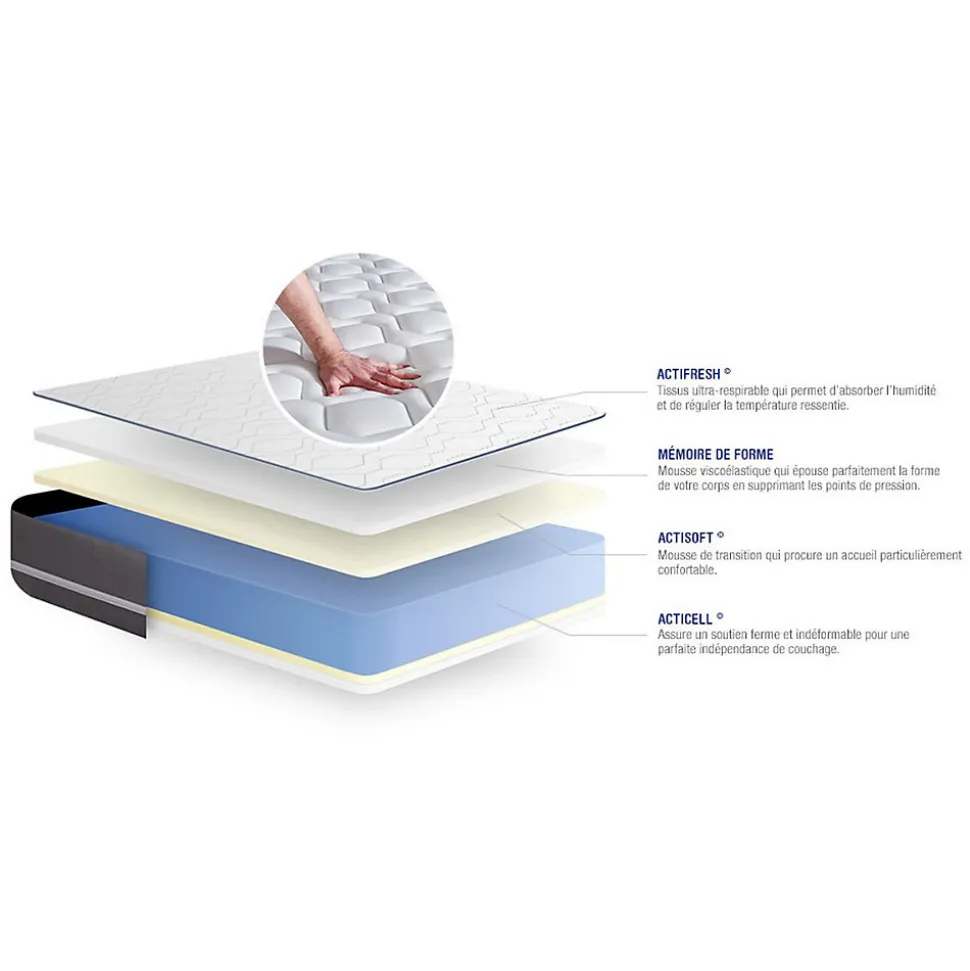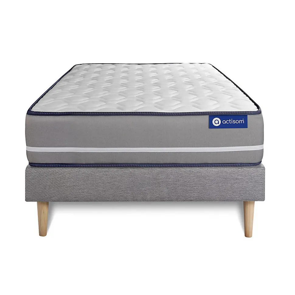 ACTISOM est une marque française développée en partenariat avec les plus grands experts européens du sommeil et de la literie. Après plusieurs années de recherche et de développement, nous avons mis au point des technologies innovantes (Actisoft – Actifresh – Acticell) afin de vous garantir d’excellentes nuits de sommeil. Tous nos matelas sont garantis 7ans et leur fabrication bénéficie d’un contrôle qualité très performant. Nos usines respectent les normes technologiques et environnementales européennes en vigueur.Le modèle Actimemo PUR de la marque ACTISOM est doté de mousse à mémoire de forme sur les deux faces. Vos points de pressions sensibles sont réduits, votre positition de couchage est confortable en maximisant votre relaxation. Son ame haute densité vous apporte un soutien très ferme. Avec sa technologie Actifresh votre corps se régénère naturellement grâce à la thermorégulation des matières de garnissages.Epaisseur 20 cmPlateau pour les 2 faces 2,5cm Mousse polyuréthane à mémoire de forme + mousse polyuréthane actiSoftSoutien en mousse polyuréthane haute densité 15cmCoutil 100% polyester micro-perforé ultra respirableConfort FermeType de sommier : Tapissier à lattes démontable à assembler soi mêmeÉpaisseur : 14 cmStructure et traverses de renfort en pin massif15 lattes multiplisGarnissage fibres 100% polyester 120G/M2Tissu maille 100% polyester 260G/M2Pieds : Bois 15cm fournisMontage facile : le montage pourra être effectué par une personne seule en seulement 10 minutes Epaisseur 20 cmPlateau pour les 2 faces 2,5cm Mousse polyuréthane à mémoire de forme + mousse polyuréthane actiSoftSoutien en mousse polyuréthane haute densité 15cmCoutil 100% polyester micro-perforé ultra respirableConfort FermeType de sommier : Tapissier à lattes démontable à assemb