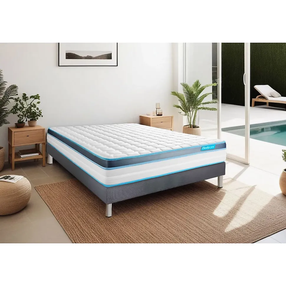 BODYCARE est née de la conviction qu’il n’existe pas de différence entre le corps d’un sportif de haut niveau et celui d’un sportif du quotidien. Pour ces sportifs de haut niveau, comme pour vous, le sommeil est une phase prépondérante dans le processus de récupération physique, nerveuse et psychologique. Nos produits sont conçus en collaboration étroite avec des sportifs. Les matelas BODYCARE allient confort, maintien et souplesse afin de permettre à votre corps de se revitaliser pour récupérer du stress de la journée.Le matelas PERFORM de la marque BODYCARE bénéficie des dernières innovations en matière de mousse à mémoire de forme pour vous offrir le confort et le soutien unique dont votre corps à besoin. D’une tenue ferme, son accueil enveloppant s’adapte à vos courbes et allège les points de pression en épousant les spécificités morphologiques de votre corps. Sa plate‐Bande 3D micro aérée, associée à son coutil micro perforé ultra respirable vous garantissent une aération optimisée du matelas.- Épaisseur : 23 cm- Mousse polyuréthane à mémoire de forme 4 cm- Âme 100% mousse polyuréthane Haute Densité 15cm- Garnissage fibres polyester 350G/M2- Face Hiver Coutil 100% polyester- Face été tissu micro perforé 100% polyester ultra respirable- Bandes latérales 100% polyester micro perforé- Confort : Accueil enveloppant – Soutien ferme- 5 zones de confort- Sommier tapissier- Multi 12 lattes en peuplier massif- Structure et traverses de renfort en peuplier massif- Garnissage fibres 100% polyester 120G/M2- Tissu Maille 100% polyester 260G/M2- Toile de fond anti-poussières 100% polyester- Hauteur 14cm + Pieds acier 15cm (fournis) – Épaisseur : 23 cm- Mousse polyuréthane à mémoire de forme 4 cm- Âme 100% mousse polyuréthane Haute Densité 15cm- Garnissage fibres polyester 350G/M2- Face Hiver Coutil 100% polyester- Face été tissu micro perforé 100% polyester ultra
