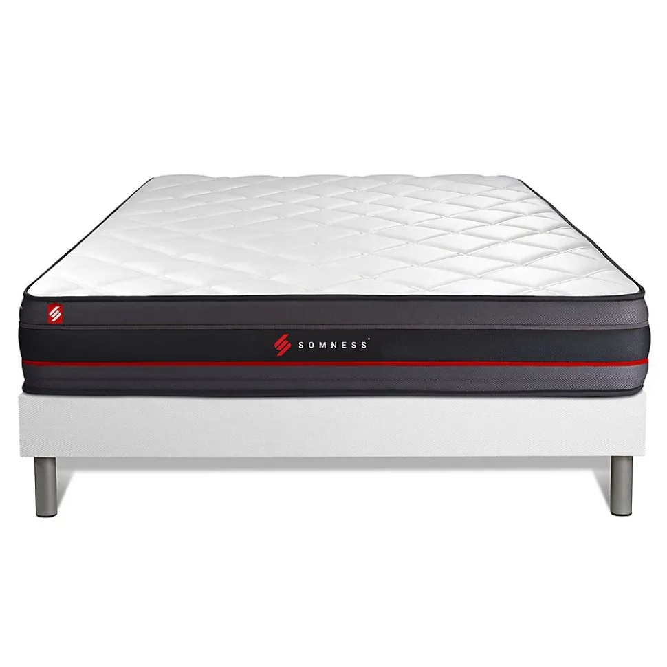 L’un des meilleurs modèles de la marque SOMNESS. L’alliance parfaite d’un accueil à mémoire de forme avec un soutien haute densité 5 zones de confort. Il dispose d’une maxi épaisseur de 24cm et est doté de la technologie Freshair qui permet une aération optimale. Le matelas REGEN est le matelas idéal.- Type de matelas : Mémoire de forme- Epaisseur : 24 cm- Confort : ferme- Accueil : Enveloppant avec 2,5 cm de mousse polyuréthane à mémoire de forme + soft- Soutien : 16cm de mousse polyuréthane- Indépendance de couchage : Excellente- Coutil 100% polyester microperforé ultra-respirable- Plate-Bande en tissu 3D micro-perforé 100% Polyester pour optimiser l’aération du matelas- Face de couchage : Réversible- Densité : 55 kg/m3- Certification : Oeko-Tex- Sommier tapissier- Multi 12 lattes en peuplier massif- Structure et traverses de renfort en peuplier massif- Garnissage fibres 100% polyester 120G/M2- Tissu Maille 100% polyester 260G/M2- Toile de fond anti-poussières 100% polyester- Hauteur 14cm + Pieds acier 15cm – Type de matelas : Mémoire de forme- Epaisseur : 24 cm- Confort : ferme- Accueil : Enveloppant avec 2,5 cm de mousse polyuréthane à mémoire de forme + soft- Soutien : 16cm de mousse polyuréthane- Indépendance de couchage : Excellente- Coutil 100% polyester microperforé ultra-respirable- Plate-Bande en tissu 3D micro-perforé 100% Polyester pour optimiser l’aération du matelas- Face de couchage : Réversible- Densité : 55 kg/m3- Certification : Oeko-Tex- Sommier tapissier- Multi 12 lattes en peuplier massif- Structure et traverses de renfort en peuplier massif- Garnissage fibres 100% polyester 120G/M2- Tissu Maille 100% polyester 260G/M2- Toile de fond anti-poussières 100% polyester- Hauteur 14cm + Pieds acier 15cm
