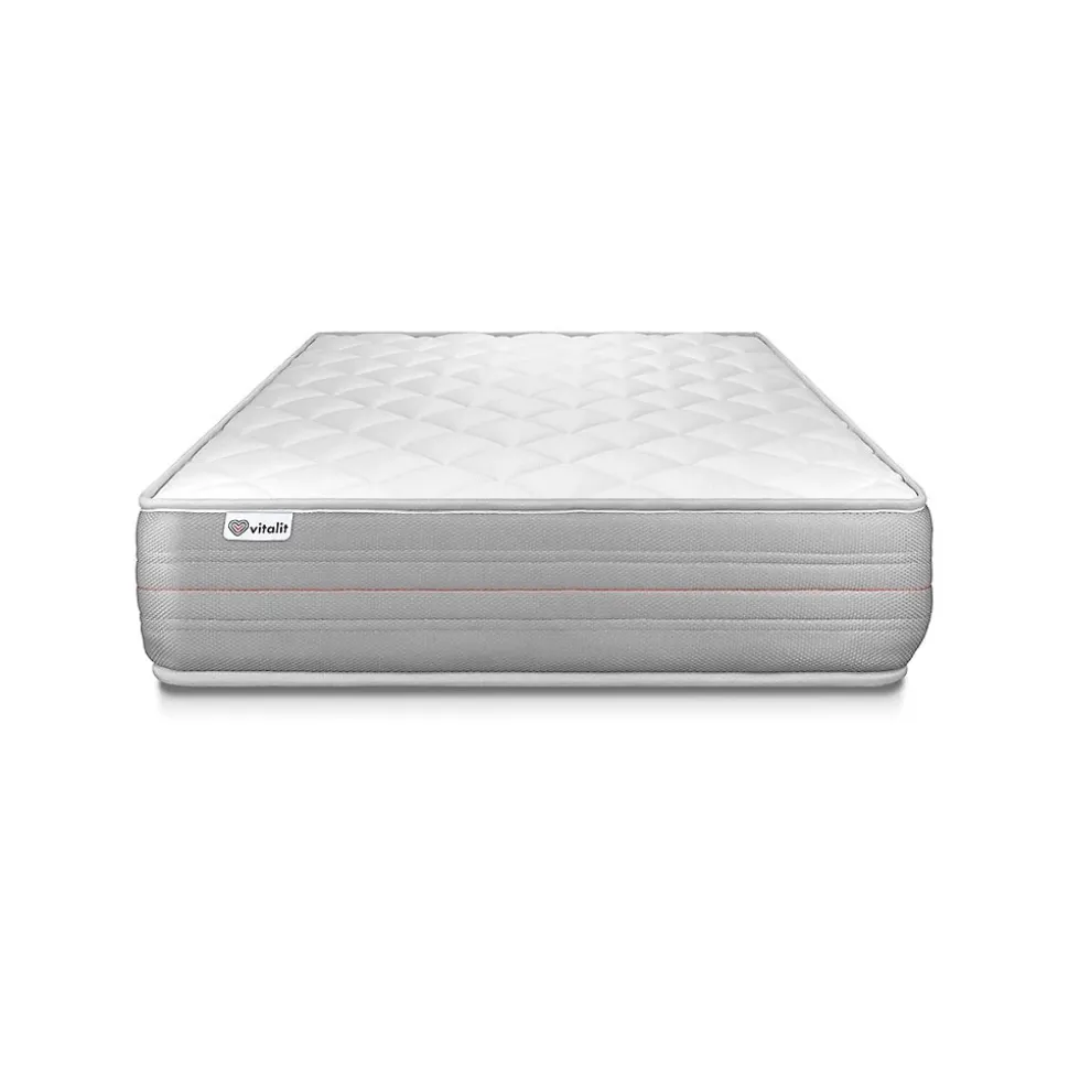 Faites le plein d’énergie positive grâce aux solutions de literie énergisantes Vitalit qui allient confort, maintien et souplesse et permettre à votre corps de prendre le temps de se revitaliser. Les matelas et sommiers Vitalit sont pensés pour s’adapter aux spécificités corporelles et au sommeil de chacun. De fabrication portugaise, les produits Vitalit sont rigoureusement élaborés selon des cahiers des charges précis. Jusqu’à la livraison, notre objectif : votre satisfaction.Le matelas VITALMEMO d’une épaisseur de 18 cm bénéficie des dernières innovations en matière de mousse à mémoire de forme. D’une tenue ferme, son accueil enveloppant s’adapte à votre morphologie et allège les points de pression. Son tissu micro perforé garantit une aération optimisée.Epaisseur : 18 cmÂme 100% mousse polyuréthane Haute Densité 15 cmMousse polyuréthane à mémoire de forme D 55 kgFibres 100% Polyester 350G/M2Plate-Bande 3D micro-aérée 100% Polyester pour optimiser l’aération du matelasCoutil micro perforé ultra respirable 100% PolyesterConfort : FermeAccueil DynamiqueSoutien ferme3 zones de confortSommier tapissierMulti 12 lattes en peuplier massifStructure et traverses de renfort en peuplier massifGarnissage fibres 100% polyester 120G/M2Tissu Maille 100% polyester 260G/M2 respirableToile de fond 100% polyester anti-poussièresHauteur 14cm + Pieds acier 15cm (fournis)Adapté pour tous types de matelasLivré assemblé Epaisseur : 18 cmÂme 100% mousse polyuréthane Haute Densité 15 cmMousse polyuréthane à mémoire de forme D 55 kgFibres 100% Polyester 350G/M2Plate-Bande 3D micro-aérée 100% Polyester pour optimiser l’aération du matelasCoutil micro perforé ultra respirable 100% PolyesterConfort : FermeAccueil Dynamique