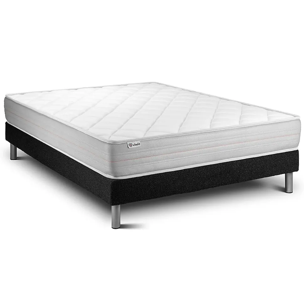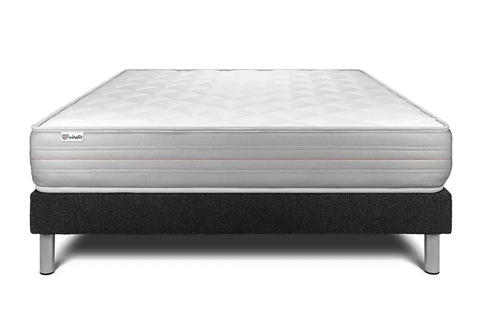 Faites le plein d’énergie positive grâce aux solutions de literie énergisantes Vitalit qui allient confort, maintien et souplesse et permettre à votre corps de prendre le temps de se revitaliser. Les matelas et sommiers Vitalit sont pensés pour s’adapter aux spécificités corporelles et au sommeil de chacun. De fabrication portugaise, les produits Vitalit sont rigoureusement élaborés selon des cahiers des charges précis. Jusqu’à la livraison, notre objectif : votre satisfaction.Le matelas VITALMEMO d’une épaisseur de 18 cm bénéficie des dernières innovations en matière de mousse à mémoire de forme. D’une tenue ferme, son accueil enveloppant s’adapte à votre morphologie et allège les points de pression. Son tissu micro perforé garantit une aération optimisée.Epaisseur : 18 cmÂme 100% mousse polyuréthane Haute Densité 15 cmMousse polyuréthane à mémoire de forme D 55 kgFibres 100% Polyester 350G/M2Plate-Bande 3D micro-aérée 100% Polyester pour optimiser l’aération du matelasCoutil micro perforé ultra respirable 100% PolyesterConfort : FermeAccueil DynamiqueSoutien ferme3 zones de confortSommier tapissierMulti 12 lattes en peuplier massifStructure et traverses de renfort en peuplier massifGarnissage fibres 100% polyester 120G/M2Tissu Maille 100% polyester 855G/M2 résistant certifié OEKO-TEX Standard 100Toile de fond 100% polyester anti-poussièresHauteur 14cm + Pieds acier 15cm (fournis)Adapté pour tous types de matelasLivré assemblé Epaisseur : 18 cmÂme 100% mousse polyuréthane Haute Densité 15 cmMousse polyuréthane à mémoire de forme D 55 kgFibres 100% Polyester 350G/M2Plate-Bande 3D micro-aérée 100% Polyester pour optimiser l’aération du matelasCoutil micro perforé ultra respirable 100% PolyesterConfort : Ferme
