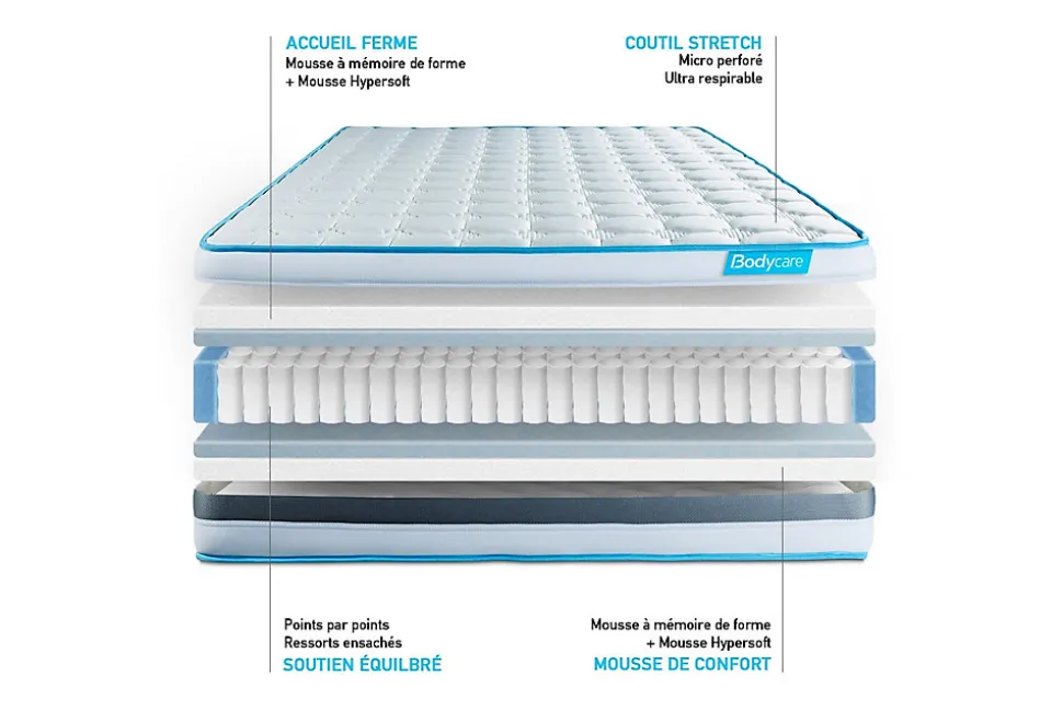 BODYCARE est née de la conviction qu’il n’existe pas de différence entre le corps d’un sportif de haut niveau et celui d’un sportif du quotidien. Pour ces sportifs de haut niveau, comme pour vous, le sommeil est une phase prépondérante dans le processus de récupération physique, nerveuse et psychologique. Nos produits sont conçus en collaboration étroite avec des sportifs. Les matelas BODYCARE allient confort, maintien et souplesse afin de permettre à votre corps de se revitaliser pour récupérer du stress de la journée.Le matelas BodyFlex est l’alliance parfaite de la mousse à mémoire de fome et des ressorts ensachés.Ce matelas dispose d’une maxi épaisseur de 26cm.- Type de matelas : Mémoire de forme et ressorts ensachés- Epaisseur : 25/26 cm- Confort : Equilibré- Accueil : Moelleux avec 4cm de mousse polyuréthane à mémoire de forme + mousse mousse soft pour les 2 faces- Soutien : Ressorts ensachés- Indépendance de couchage : Excellente- Zone de confort : 7 zones de confort- Coutil : 100% polyester micro perforé ultra-respirable- Bande latérale : 100% polyester micro perforé ultra-respirable- Face de couchage : Face été / Face hiver- Densité : 55 kg/m3- Certification : Oeko-Tex- Type de sommier : Tapissier à lattes démontable à assembler soi même- Epaisseur du sommier : 14cm- Nombre de lattes : 2×15 lattes multiplis- Garnissage fibres 100% Polyester 120G/M2- Tissu Maille 100% polyester 260 G/M2- Pieds : Acier 15cm fournis- Hauteur 14cm + Pieds acier 15cm- Montage facile: le montage pourra être effectué par une personne seule en 10 min seulement – Type de matelas : Mémoire de forme et ressorts ensachés- Epaisseur : 25/26 cm- Confort : Equilibré- Accueil : Moelleux avec 4cm de mousse polyuréthane à mémoire de forme + mousse mousse soft pour les 2 faces- Soutien : Ressorts ensachés- Indépendance de couchage : Excellente- Zone de confort