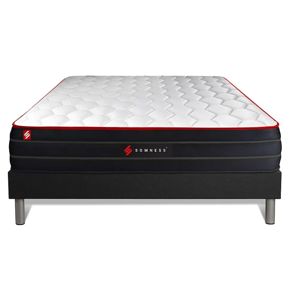 Le matelas BOOST est l’aboutissment de plusieurs années de recherche et développement. L’alliance de la mousse à mémoire de fome et des ressorts ensachés en fait l’un des modèles les plus haut de gamme de la marque Somness.L’avis de notre expert: Ce matelas dispose d’une maxi épaisseur de 26cm, d’un confort inégalé, votre corps le remerciera chaque matin.- Type de matelas : Mémoire de forme et ressorts ensachés- Epaisseur : 26 cm- Confort : Equilibré- Accueil : Moelleux avec 4cm mousse polyuréthane à mémoire de forme + mousse soft pour les 2 faces- Soutien : 961 Ressorts ensachés- Indépendance de couchage : Excellente- Zone de confort : 7 zones de confort- Coutil 100% polyester micro perforé ultra-respirable- Plate-Bande en tissu 3D micro-perforé 100% Polyester pour optimiser l’aération du matelas- Face de couchage : Face été / Face hiver- Densité : 55 kg/m3- Certification : Oeko-Tex- Type de sommier : Tapissier à lattes démontable à assembler soi même- Epaisseur du sommier : 14cm- Nombre de lattes : 2×15 lattes multiplis- Garnissage fibres 100% polyester 120G/M2- Tissu Maille 100% polyester 260 G/M2- Pieds : Acier 15cm fournis- Hauteur 14cm + Pieds acier 15cm- Montage facile: le montage pourra être effectué par une personne seule en 10 min seulement – Type de matelas : Mémoire de forme et ressorts ensachés- Epaisseur : 26 cm- Confort : Equilibré- Accueil : Moelleux avec 4cm mousse polyuréthane à mémoire de forme + mousse soft pour les 2 faces- Soutien : 961 Ressorts ensachés- Indépendance de couchage : Excellente- Zone de confort : 7 zones de confort- Coutil 100% polyester micro perforé ultra-respirable- Plate-Bande en tissu 3D micro-perforé 100% Polyester pour optimiser l’aération du matelas- Face de couchage : Face été / Face hiver- Densité : 55 kg/m3- Certification : Oeko-Tex- Ty