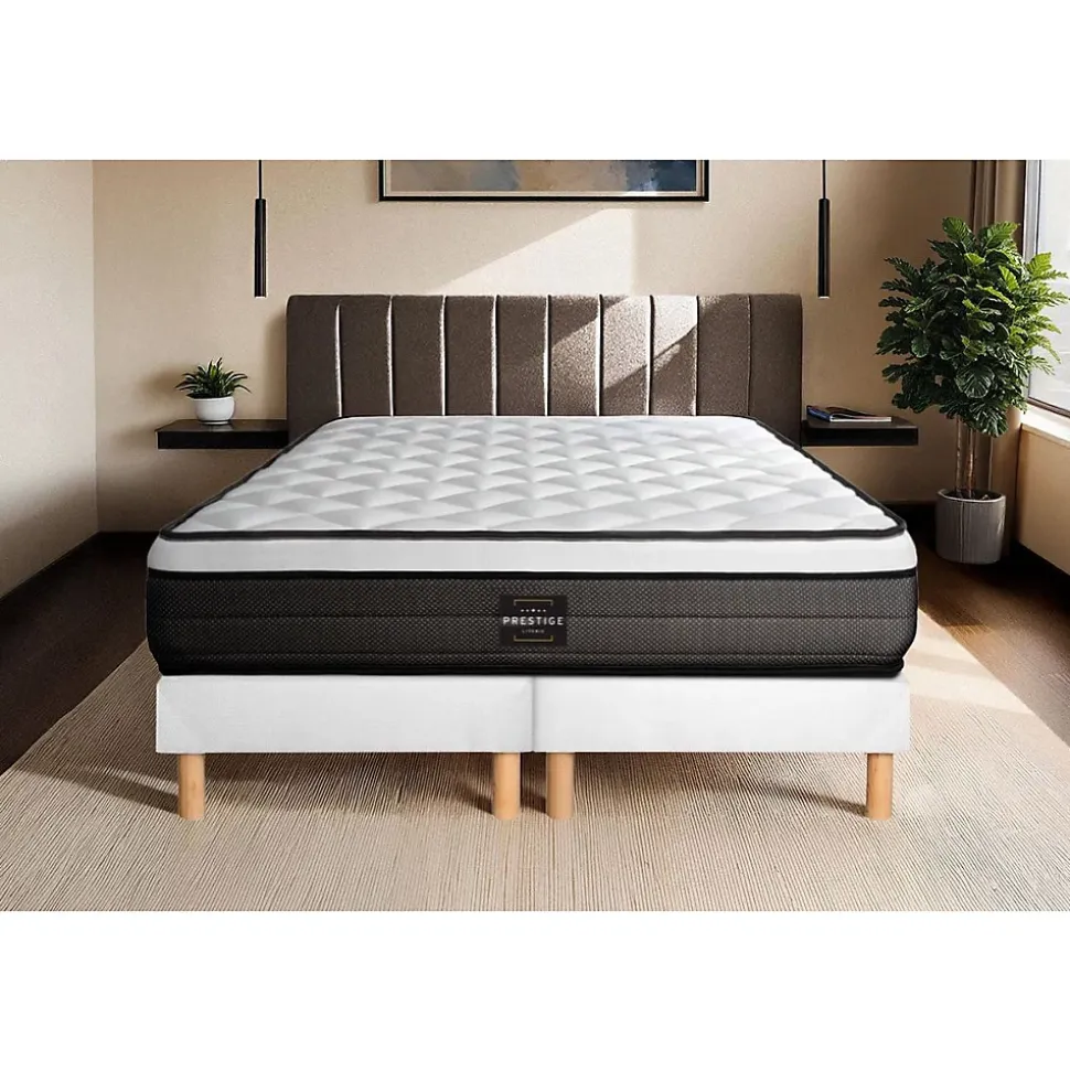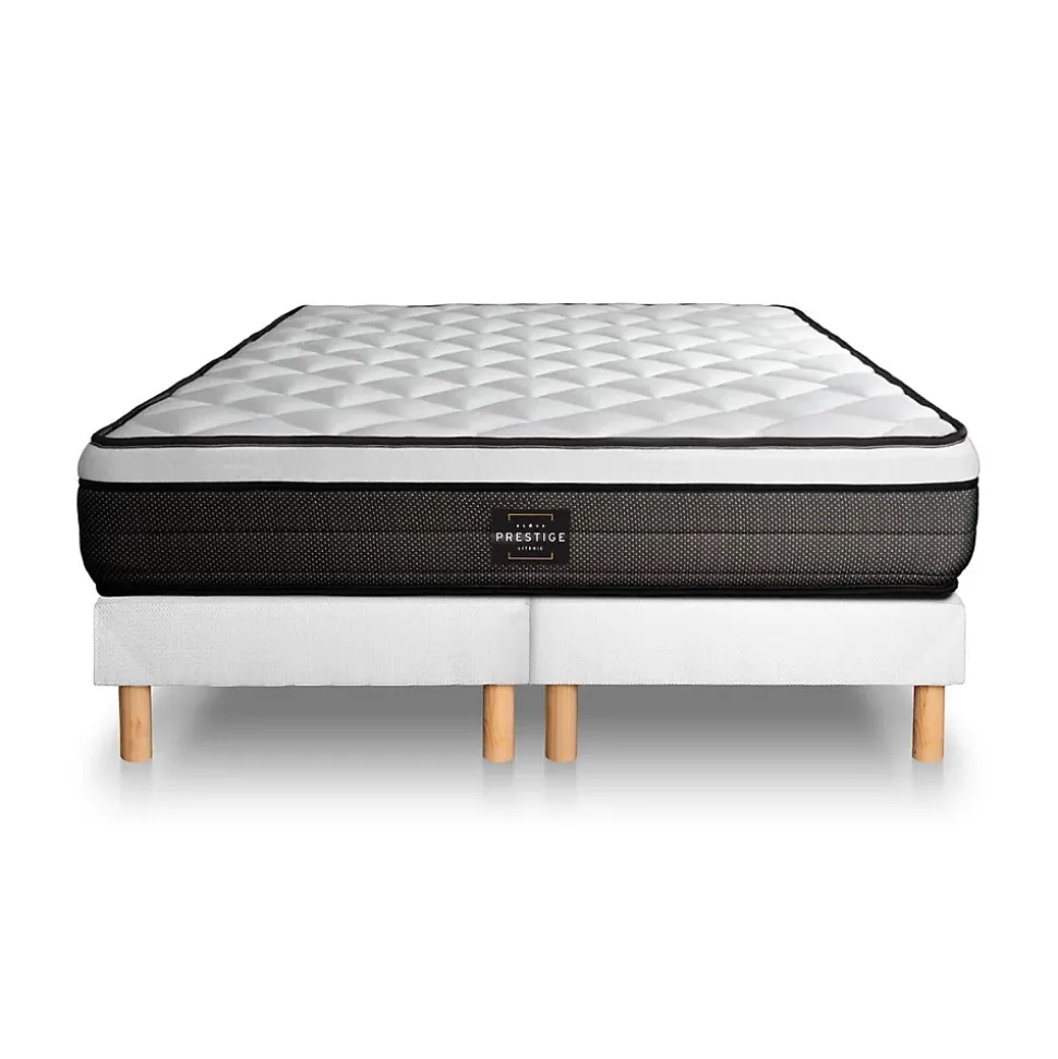 Produit à usage professionnel et particulier.Retrouvez le confort des plus grands hôtels chez vous avec les matelas et ensemble Prestige Literie. Riche d’une grande expérience dans le domaine de l’hôtellerie, nos ensembles et matelas Prestige Literie sont l’association de technologies innovantes et d’une fabrication de qualité pour vous apporter un sommeil 5 étoiles. Afin de vous convaincre de la qualité de nos produits, nous vous offrons 15 nuits d’essais satisfait ou remboursé. Nos produits sont garantie 10 ans et vous bénéficiez d’une livraison offerte.Un accueil moelleux et enveloppant grâce au surmatelas en mousse à mémoire de forme intégré. La technologie à ressorts ensachés se révèle être l’une des plus performantes en terme d’indépendance de couchage. Le matelas Suite vous apporte le confort absolu dont vous rêvez.MATELAS• Type de matelas : Mémoire de forme et ressorts ensachés• Epaisseur : 26 cm• Confort : Equilibré• Accueil : Enveloppant avec 4 cm de mousse polyuréthane à mémoire de forme + hypersoft• Soutien : Equilibré point par point composé de ressorts ensachés• Indépendance de couchage : Excellente• Coutil 100% polyester• Densité : 55 kg/m3• Certification : Oeko-TexSOMMIER• Type de sommier : Tapissier à lattes• Épaisseur :14 cm• 2×12 lattes en peuplier massif• Structure et traverses de renfort en peuplier massif• Garnissage fibres 100% polyester 260 G/M2• Plate bandes Tissu Maille 100% polyester 260G/M2• Toile de fond anti-poussières 100% polyester• Pieds : 15cm fournis MATELAS• Type de matelas : Mémoire de forme et ressorts ensachés• Epaisseur : 26 cm• Confort : Equilibré• Accueil : Enveloppant avec 4 cm de mousse polyuréthane à mémoire de forme + hypersoft• Soutien : Equilibré point par point composé de ressorts ensachés• Indépendance de couchage : Excellente• Coutil 100% polyester• Densité : 55 kg/m3