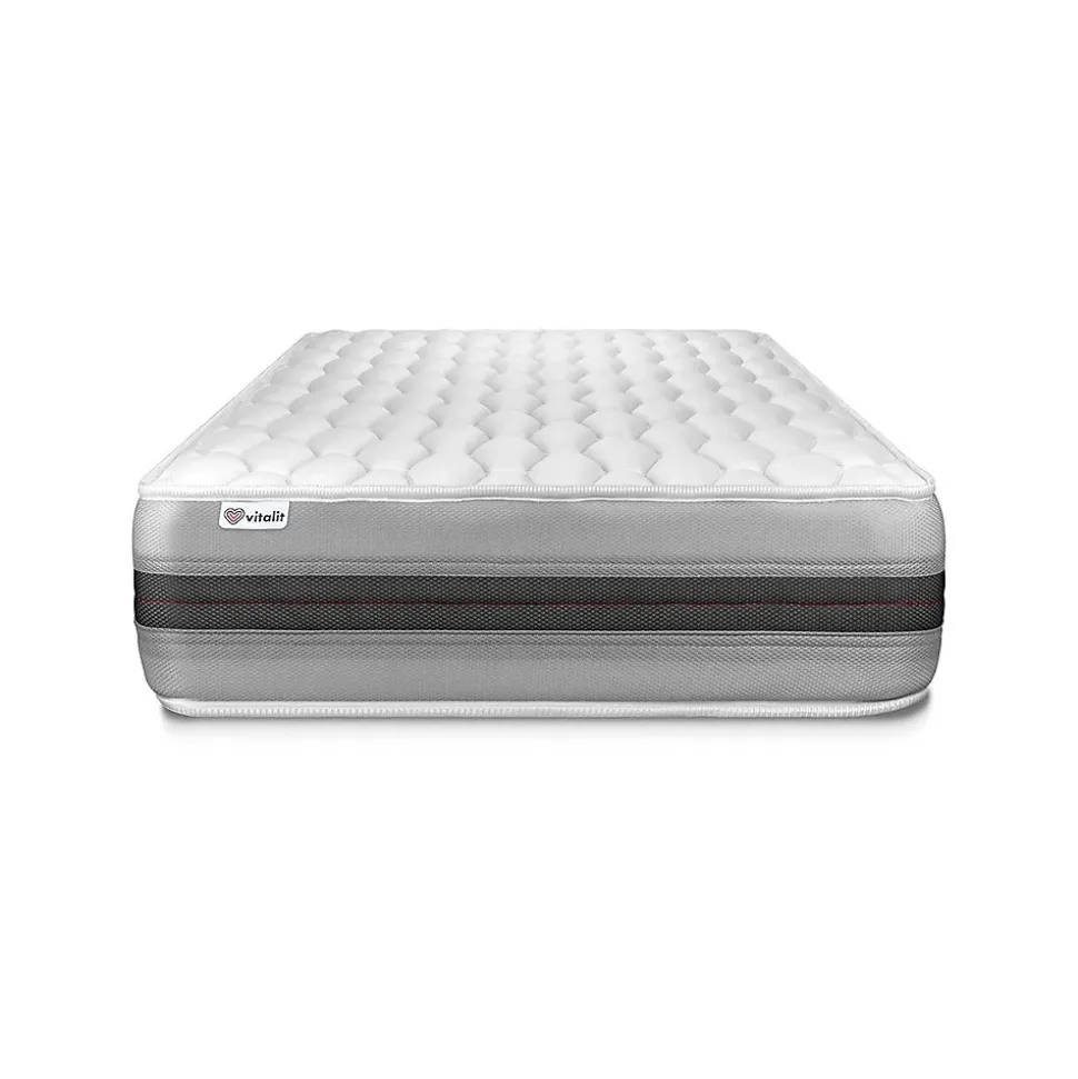Faites le plein d’énergie positive grâce aux solutions de literie énergisantes Vitalit qui allient confort, maintien et souplesse et permettre à votre corps de prendre le temps de se revitaliser. Les matelas et sommiers Vitalit sont pensés pour s’adapter aux spécificités corporelles et au sommeil de chacun. De fabrication portugaise, les produits Vitalit sont rigoureusement élaborés selon des cahiers des charges précis. Jusqu’à la livraison, notre objectif : votre satisfaction.D’une maxi épaisseur de 28 cm, le Matelas hybride VITALSPRING RECOVER bénéficie de l’alliance des technologies ressorts et mousse à mémoire de forme. Les ressorts ensachés permettent un soutien ferme et une excellente indépendance de couchage et durable tandis que la mousse à mémoire de forme vous procure un accueil enveloppant. Son coutil micro perforé permet une aération optimisée.Epaisseur 28 cmÂme ressorts ensachés 17 cmNombre de ressorts ensachés : 372 pour le 90x200cmCarénage mousse polyuréthane 30kgMousse polyuréthane à mémoire de forme D 55 kg + Mousse polyuréthane Soft HDFibres 100% Polyester 350G/M2Coutil micro perforé ultra respirable 100% Polyester7 zones de confortConfort : ÉquilibréAccueil moelleuxSoutien fermeSommier tapissierMulti 12 lattes en peuplier massifStructure et traverses de renfort en peuplier massifGarnissage fibres 100% polyester 120G/M2Tissu Maille 100% polyester 855G/M2 respirableToile de fond 100% polyester anti-poussièresHauteur 14cm + Pieds acier 15cm (fournis)Adapté pour tous types de matelasLivré assemblé Epaisseur 28 cmÂme ressorts ensachés 17 cmNombre de ressorts ensachés : 372 pour le 90x200cmCarénage mousse polyuréthane 30kgMousse polyuréthane à mémoire de forme D 55 kg + Mousse polyuréthane Soft HDFib
